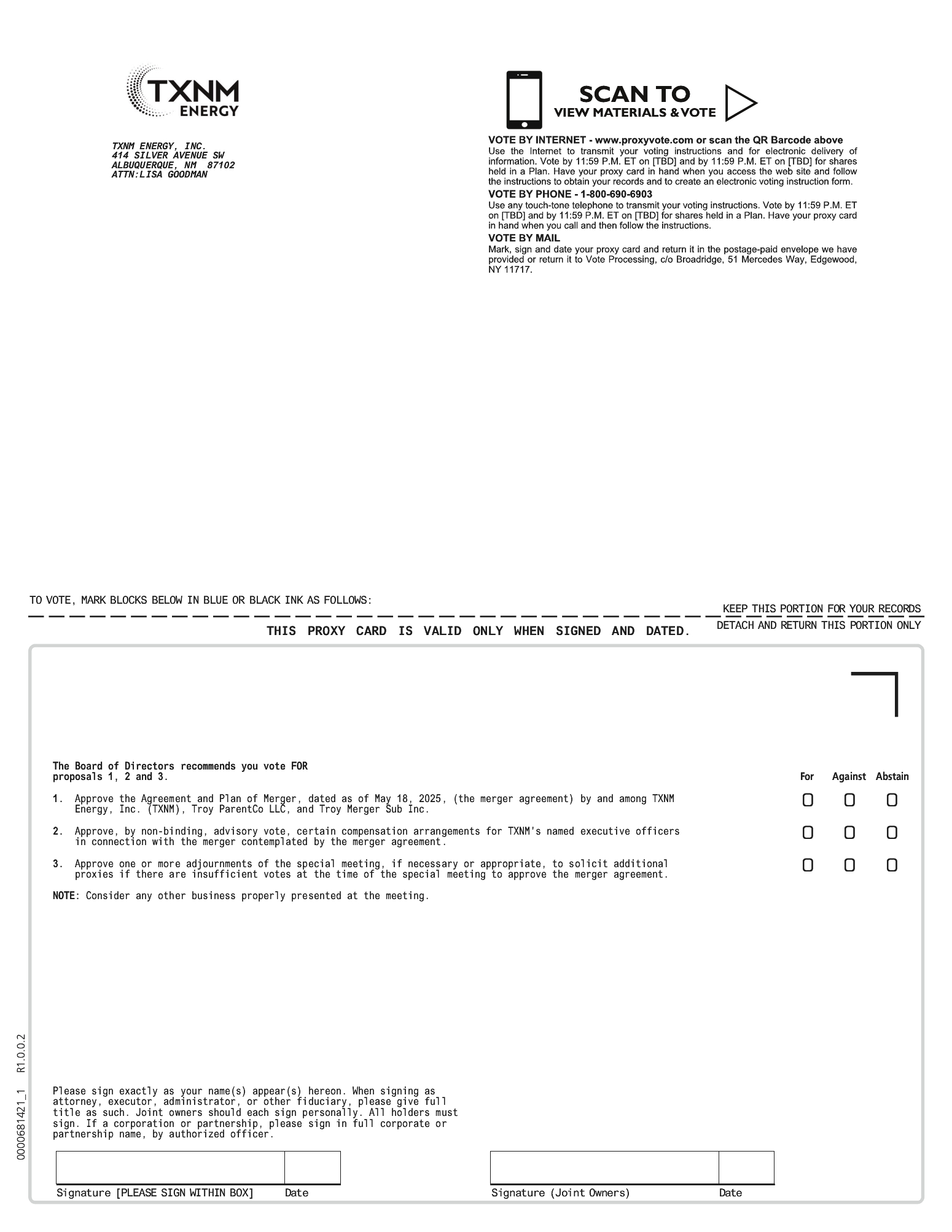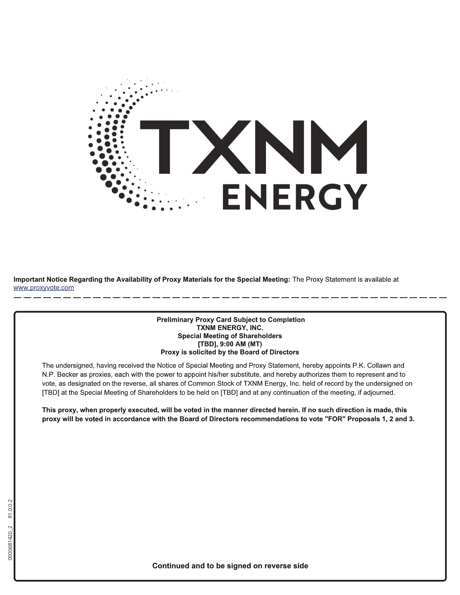 YOUR PROXY IS BEING SOLICITED BY THE BOARD OF DIRECTORS OF TXNM. AFTER CAREFUL CONSIDERATION, OUR BOARD OF DIRECTORS HAS UNANIMOUSLY DETERMINED THAT THE MERGER CONSIDERATION IS FAIR, FROM A FINANCIAL POINT OF VIEW, TO TXNM’S SHAREHOLDERS, DECLARED THE MERGER AGREEMENT AND THE TRANSACTIONS CONTEMPLATED BY THE MERGER AGREEMENT, INCLUDING THE MERGER, CONSISTENT WITH AND IN FURTHERANCE OF TXNM’S BUSINESS STRATEGIES AND FAIR TO AND IN THE BEST INTERESTS OF TXNM AND ITS SHAREHOLDERS AND RESOLVED TO SUBMIT THE MERGER AGREEMENT FOR CONSIDERATION AND APPROVAL BY TXNM SHAREHOLDERS AND RECOMMEND THE APPROVAL OF THE MERGER AGREEMENT BY TXNM SHAREHOLDERS. THE BOARD OF DIRECTORS UNANIMOUSLY RECOMMENDS THAT YOU VOTE “FOR” THE PROPOSAL TO APPROVE THE MERGER AGREEMENT AND “FOR” THE OTHER MATTERS DESCRIBED IN THE ACCOMPANYING PROXY STATEMENT. THE BOARD OF DIRECTORS MADE ITS DETERMINATION AFTER CONSULTATION WITH ITS LEGAL AND FINANCIAL ADVISORS AND AFTER CONSIDERING A NUMBER OF FACTORS.