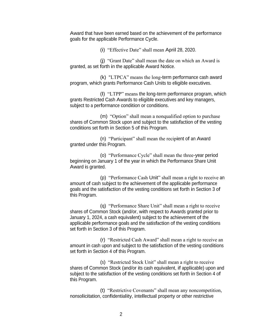 2 Award that have been earned based on the achievement of the performance goals for the applicable Performance Cycle. (i) “Effective Date” shall mean April 28, 2020. (j) “Grant Date” shall mean the date on which an Award is granted, as set forth in the applicable Award Notice. (k) "LTPCA” means the long-term performance cash award program, which grants Performance Cash Units to eligible executives. (l) “LTPP” means the long-term performance program, which grants Restricted Cash Awards to eligible executives and key managers, subject to a performance condition or conditions. (m) “Option” shall mean a nonqualified option to purchase shares of Common Stock upon and subject to the satisfaction of the vesting conditions set forth in Section 5 of this Program. (n) “Participant” shall mean the recipient of an Award granted under this Program. (o) “Performance Cycle” shall mean the three-year period beginning on January 1 of the year in which the Performance Share Unit Award is granted. (p) “Performance Cash Unit” shall mean a right to receive an amount of cash subject to the achievement of the applicable performance goals and the satisfaction of the vesting conditions set forth in Section 3 of this Program. (q) “Performance Share Unit” shall mean a right to receive shares of Common Stock (and/or, with respect to Awards granted prior to January 1, 2024, a cash equivalent) subject to the achievement of the applicable performance goals and the satisfaction of the vesting conditions set forth in Section 3 of this Program. (r) “Restricted Cash Award” shall mean a right to receive an amount in cash upon and subject to the satisfaction of the vesting conditions set forth in Section 4 of this Program. (s) “Restricted Stock Unit” shall mean a right to receive shares of Common Stock (and/or its cash equivalent, if applicable) upon and subject to the satisfaction of the vesting conditions set forth in Section 4 of this Program. (t) “Restrictive Covenants” shall mean any noncompetition, nonsolicitation, confidentiality, intellectual property or other restrictive