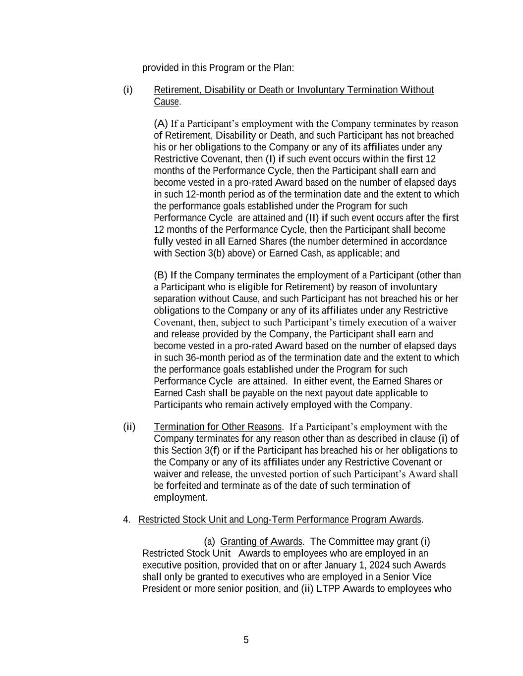 5 provided in this Program or the Plan: (i) Retirement, Disability or Death or Involuntary Termination Without Cause. (A) If a Participant’s employment with the Company terminates by reason of Retirement, Disability or Death, and such Participant has not breached his or her obligations to the Company or any of its affiliates under any Restrictive Covenant, then (I) if such event occurs within the first 12 months of the Performance Cycle, then the Participant shall earn and become vested in a pro-rated Award based on the number of elapsed days in such 12-month period as of the termination date and the extent to which the performance goals established under the Program for such Performance Cycle are attained and (II) if such event occurs after the first 12 months of the Performance Cycle, then the Participant shall become fully vested in all Earned Shares (the number determined in accordance with Section 3(b) above) or Earned Cash, as applicable; and (B) If the Company terminates the employment of a Participant (other than a Participant who is eligible for Retirement) by reason of involuntary separation without Cause, and such Participant has not breached his or her obligations to the Company or any of its affiliates under any Restrictive Covenant, then, subject to such Participant’s timely execution of a waiver and release provided by the Company, the Participant shall earn and become vested in a pro-rated Award based on the number of elapsed days in such 36-month period as of the termination date and the extent to which the performance goals established under the Program for such Performance Cycle are attained. In either event, the Earned Shares or Earned Cash shall be payable on the next payout date applicable to Participants who remain actively employed with the Company. (ii) Termination for Other Reasons. If a Participant’s employment with the Company terminates for any reason other than as described in clause (i) of this Section 3(f) or if the Participant has breached his or her obligations to the Company or any of its affiliates under any Restrictive Covenant or waiver and release, the unvested portion of such Participant’s Award shall be forfeited and terminate as of the date of such termination of employment. 4. Restricted Stock Unit and Long-Term Performance Program Awards. (a) Granting of Awards. The Committee may grant (i) Restricted Stock Unit Awards to employees who are employed in an executive position, provided that on or after January 1, 2024 such Awards shall only be granted to executives who are employed in a Senior Vice President or more senior position, and (ii) LTPP Awards to employees who