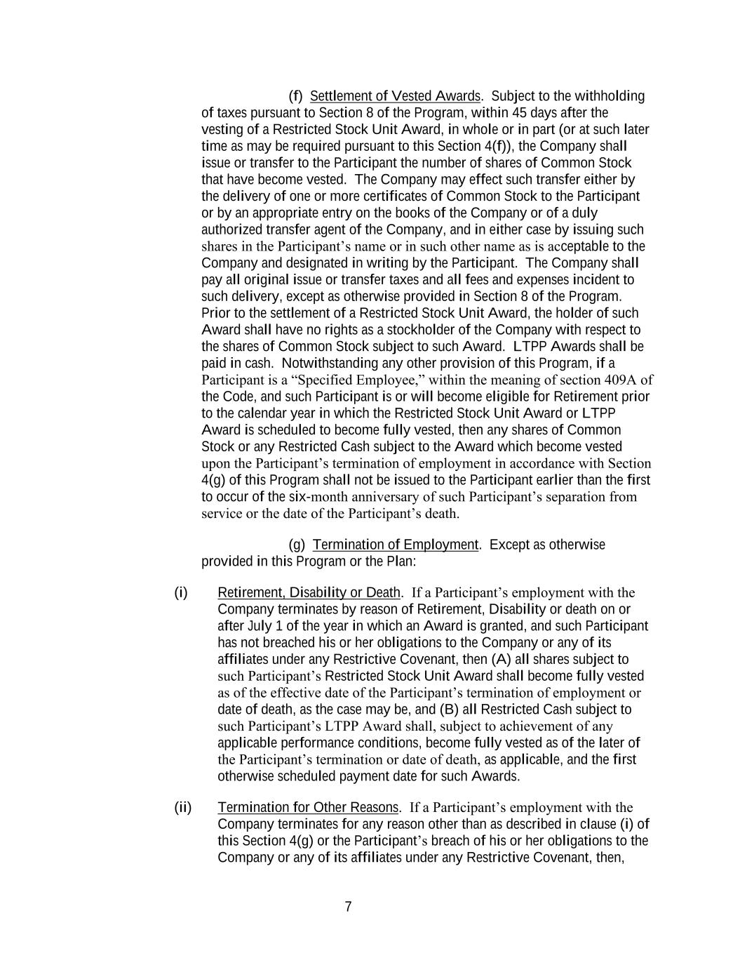 7 (f) Settlement of Vested Awards. Subject to the withholding of taxes pursuant to Section 8 of the Program, within 45 days after the vesting of a Restricted Stock Unit Award, in whole or in part (or at such later time as may be required pursuant to this Section 4(f)), the Company shall issue or transfer to the Participant the number of shares of Common Stock that have become vested. The Company may effect such transfer either by the delivery of one or more certificates of Common Stock to the Participant or by an appropriate entry on the books of the Company or of a duly authorized transfer agent of the Company, and in either case by issuing such shares in the Participant’s name or in such other name as is acceptable to the Company and designated in writing by the Participant. The Company shall pay all original issue or transfer taxes and all fees and expenses incident to such delivery, except as otherwise provided in Section 8 of the Program. Prior to the settlement of a Restricted Stock Unit Award, the holder of such Award shall have no rights as a stockholder of the Company with respect to the shares of Common Stock subject to such Award. LTPP Awards shall be paid in cash. Notwithstanding any other provision of this Program, if a Participant is a “Specified Employee,” within the meaning of section 409A of the Code, and such Participant is or will become eligible for Retirement prior to the calendar year in which the Restricted Stock Unit Award or LTPP Award is scheduled to become fully vested, then any shares of Common Stock or any Restricted Cash subject to the Award which become vested upon the Participant’s termination of employment in accordance with Section 4(g) of this Program shall not be issued to the Participant earlier than the first to occur of the six-month anniversary of such Participant’s separation from service or the date of the Participant’s death. (g) Termination of Employment. Except as otherwise provided in this Program or the Plan: (i) Retirement, Disability or Death. If a Participant’s employment with the Company terminates by reason of Retirement, Disability or death on or after July 1 of the year in which an Award is granted, and such Participant has not breached his or her obligations to the Company or any of its affiliates under any Restrictive Covenant, then (A) all shares subject to such Participant’s Restricted Stock Unit Award shall become fully vested as of the effective date of the Participant’s termination of employment or date of death, as the case may be, and (B) all Restricted Cash subject to such Participant’s LTPP Award shall, subject to achievement of any applicable performance conditions, become fully vested as of the later of the Participant’s termination or date of death, as applicable, and the first otherwise scheduled payment date for such Awards. (ii) Termination for Other Reasons. If a Participant’s employment with the Company terminates for any reason other than as described in clause (i) of this Section 4(g) or the Participant’s breach of his or her obligations to the Company or any of its affiliates under any Restrictive Covenant, then,