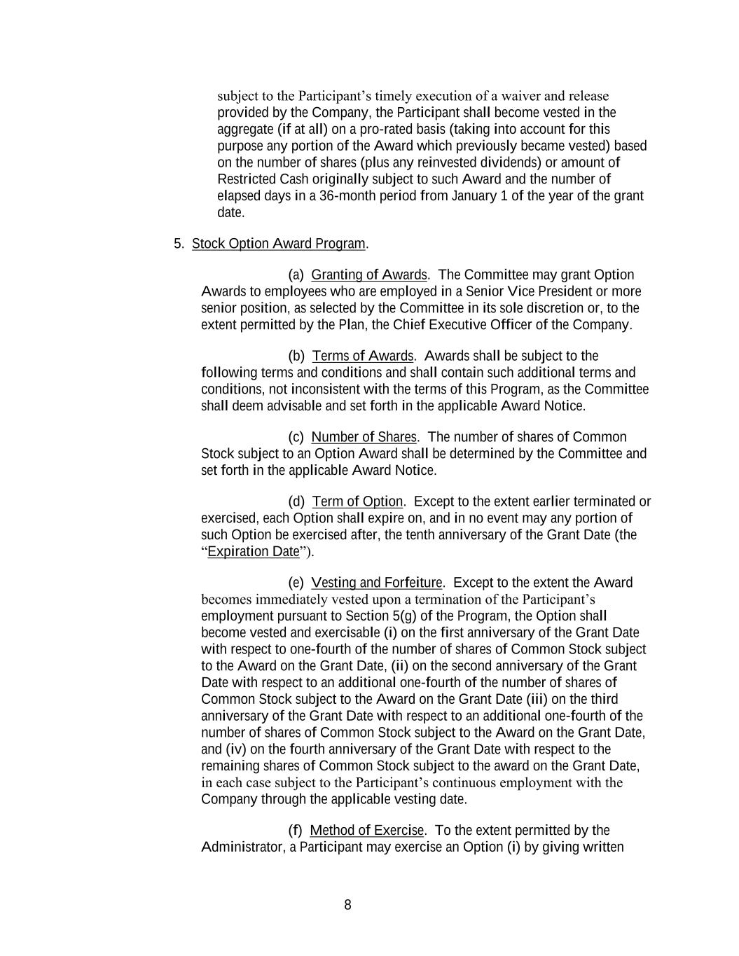 8 subject to the Participant’s timely execution of a waiver and release provided by the Company, the Participant shall become vested in the aggregate (if at all) on a pro-rated basis (taking into account for this purpose any portion of the Award which previously became vested) based on the number of shares (plus any reinvested dividends) or amount of Restricted Cash originally subject to such Award and the number of elapsed days in a 36-month period from January 1 of the year of the grant date. 5. Stock Option Award Program. (a) Granting of Awards. The Committee may grant Option Awards to employees who are employed in a Senior Vice President or more senior position, as selected by the Committee in its sole discretion or, to the extent permitted by the Plan, the Chief Executive Officer of the Company. (b) Terms of Awards. Awards shall be subject to the following terms and conditions and shall contain such additional terms and conditions, not inconsistent with the terms of this Program, as the Committee shall deem advisable and set forth in the applicable Award Notice. (c) Number of Shares. The number of shares of Common Stock subject to an Option Award shall be determined by the Committee and set forth in the applicable Award Notice. (d) Term of Option. Except to the extent earlier terminated or exercised, each Option shall expire on, and in no event may any portion of such Option be exercised after, the tenth anniversary of the Grant Date (the “Expiration Date”). (e) Vesting and Forfeiture. Except to the extent the Award becomes immediately vested upon a termination of the Participant’s employment pursuant to Section 5(g) of the Program, the Option shall become vested and exercisable (i) on the first anniversary of the Grant Date with respect to one-fourth of the number of shares of Common Stock subject to the Award on the Grant Date, (ii) on the second anniversary of the Grant Date with respect to an additional one-fourth of the number of shares of Common Stock subject to the Award on the Grant Date (iii) on the third anniversary of the Grant Date with respect to an additional one-fourth of the number of shares of Common Stock subject to the Award on the Grant Date, and (iv) on the fourth anniversary of the Grant Date with respect to the remaining shares of Common Stock subject to the award on the Grant Date, in each case subject to the Participant’s continuous employment with the Company through the applicable vesting date. (f) Method of Exercise. To the extent permitted by the Administrator, a Participant may exercise an Option (i) by giving written