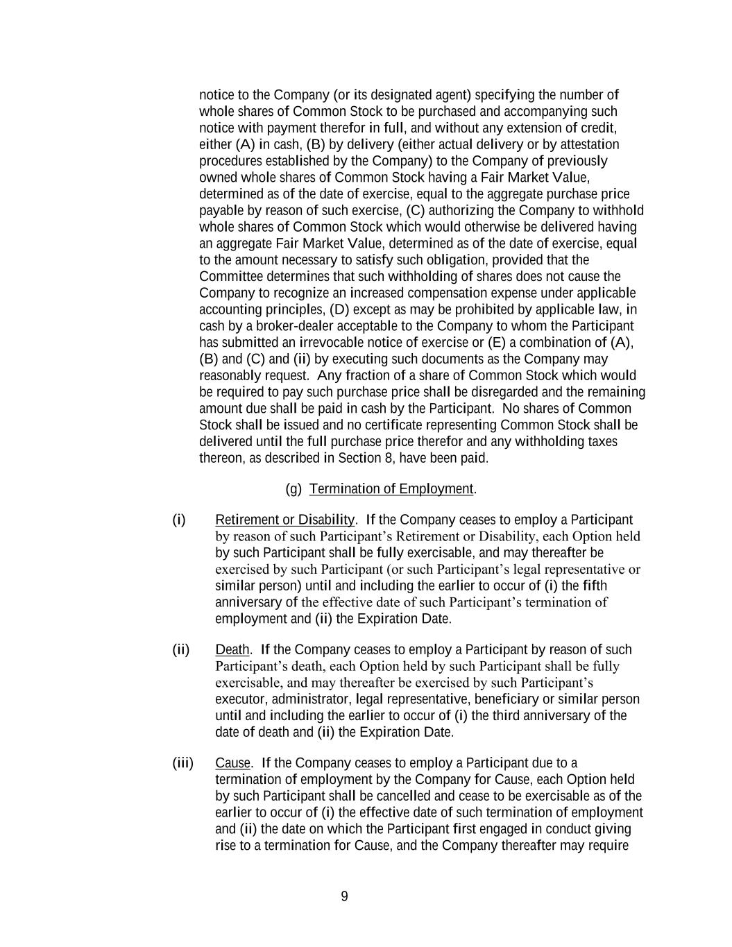 9 notice to the Company (or its designated agent) specifying the number of whole shares of Common Stock to be purchased and accompanying such notice with payment therefor in full, and without any extension of credit, either (A) in cash, (B) by delivery (either actual delivery or by attestation procedures established by the Company) to the Company of previously owned whole shares of Common Stock having a Fair Market Value, determined as of the date of exercise, equal to the aggregate purchase price payable by reason of such exercise, (C) authorizing the Company to withhold whole shares of Common Stock which would otherwise be delivered having an aggregate Fair Market Value, determined as of the date of exercise, equal to the amount necessary to satisfy such obligation, provided that the Committee determines that such withholding of shares does not cause the Company to recognize an increased compensation expense under applicable accounting principles, (D) except as may be prohibited by applicable law, in cash by a broker-dealer acceptable to the Company to whom the Participant has submitted an irrevocable notice of exercise or (E) a combination of (A), (B) and (C) and (ii) by executing such documents as the Company may reasonably request. Any fraction of a share of Common Stock which would be required to pay such purchase price shall be disregarded and the remaining amount due shall be paid in cash by the Participant. No shares of Common Stock shall be issued and no certificate representing Common Stock shall be delivered until the full purchase price therefor and any withholding taxes thereon, as described in Section 8, have been paid. (g) Termination of Employment. (i) Retirement or Disability. If the Company ceases to employ a Participant by reason of such Participant’s Retirement or Disability, each Option held by such Participant shall be fully exercisable, and may thereafter be exercised by such Participant (or such Participant’s legal representative or similar person) until and including the earlier to occur of (i) the fifth anniversary of the effective date of such Participant’s termination of employment and (ii) the Expiration Date. (ii) Death. If the Company ceases to employ a Participant by reason of such Participant’s death, each Option held by such Participant shall be fully exercisable, and may thereafter be exercised by such Participant’s executor, administrator, legal representative, beneficiary or similar person until and including the earlier to occur of (i) the third anniversary of the date of death and (ii) the Expiration Date. (iii) Cause. If the Company ceases to employ a Participant due to a termination of employment by the Company for Cause, each Option held by such Participant shall be cancelled and cease to be exercisable as of the earlier to occur of (i) the effective date of such termination of employment and (ii) the date on which the Participant first engaged in conduct giving rise to a termination for Cause, and the Company thereafter may require