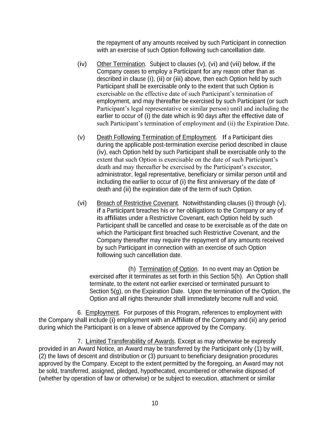 10 the repayment of any amounts received by such Participant in connection with an exercise of such Option following such cancellation date. (iv) Other Termination. Subject to clauses (v), (vi) and (vii) below, if the Company ceases to employ a Participant for any reason other than as described in clause (i), (ii) or (iii) above, then each Option held by such Participant shall be exercisable only to the extent that such Option is exercisable on the effective date of such Participant’s termination of employment, and may thereafter be exercised by such Participant (or such Participant’s legal representative or similar person) until and including the earlier to occur of (i) the date which is 90 days after the effective date of such Participant’s termination of employment and (ii) the Expiration Date. (v) Death Following Termination of Employment. If a Participant dies during the applicable post-termination exercise period described in clause (iv), each Option held by such Participant shall be exercisable only to the extent that such Option is exercisable on the date of such Participant’s death and may thereafter be exercised by the Participant’s executor, administrator, legal representative, beneficiary or similar person until and including the earlier to occur of (i) the first anniversary of the date of death and (ii) the expiration date of the term of such Option. (vi) Breach of Restrictive Covenant. Notwithstanding clauses (i) through (v), if a Participant breaches his or her obligations to the Company or any of its affiliates under a Restrictive Covenant, each Option held by such Participant shall be cancelled and cease to be exercisable as of the date on which the Participant first breached such Restrictive Covenant, and the Company thereafter may require the repayment of any amounts received by such Participant in connection with an exercise of such Option following such cancellation date. (h) Termination of Option. In no event may an Option be exercised after it terminates as set forth in this Section 5(h). An Option shall terminate, to the extent not earlier exercised or terminated pursuant to Section 5(g), on the Expiration Date. Upon the termination of the Option, the Option and all rights thereunder shall immediately become null and void. 6. Employment. For purposes of this Program, references to employment with the Company shall include (i) employment with an Affiliate of the Company and (ii) any period during which the Participant is on a leave of absence approved by the Company. 7. Limited Transferability of Awards. Except as may otherwise be expressly provided in an Award Notice, an Award may be transferred by the Participant only (1) by will, (2) the laws of descent and distribution or (3) pursuant to beneficiary designation procedures approved by the Company. Except to the extent permitted by the foregoing, an Award may not be sold, transferred, assigned, pledged, hypothecated, encumbered or otherwise disposed of (whether by operation of law or otherwise) or be subject to execution, attachment or similar