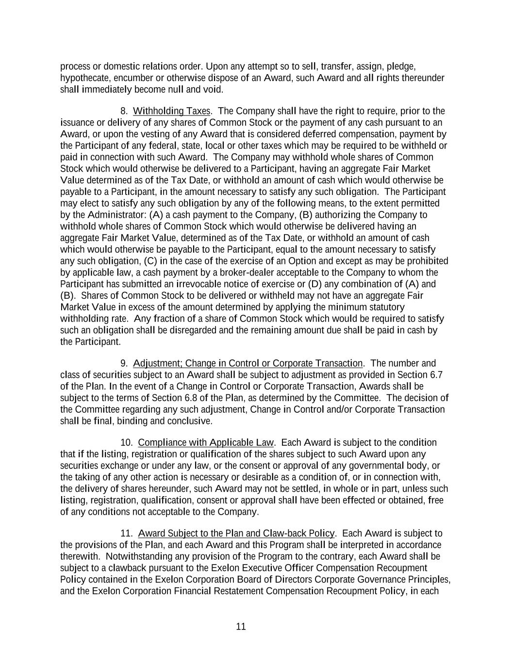 11 process or domestic relations order. Upon any attempt so to sell, transfer, assign, pledge, hypothecate, encumber or otherwise dispose of an Award, such Award and all rights thereunder shall immediately become null and void. 8. Withholding Taxes. The Company shall have the right to require, prior to the issuance or delivery of any shares of Common Stock or the payment of any cash pursuant to an Award, or upon the vesting of any Award that is considered deferred compensation, payment by the Participant of any federal, state, local or other taxes which may be required to be withheld or paid in connection with such Award. The Company may withhold whole shares of Common Stock which would otherwise be delivered to a Participant, having an aggregate Fair Market Value determined as of the Tax Date, or withhold an amount of cash which would otherwise be payable to a Participant, in the amount necessary to satisfy any such obligation. The Participant may elect to satisfy any such obligation by any of the following means, to the extent permitted by the Administrator: (A) a cash payment to the Company, (B) authorizing the Company to withhold whole shares of Common Stock which would otherwise be delivered having an aggregate Fair Market Value, determined as of the Tax Date, or withhold an amount of cash which would otherwise be payable to the Participant, equal to the amount necessary to satisfy any such obligation, (C) in the case of the exercise of an Option and except as may be prohibited by applicable law, a cash payment by a broker-dealer acceptable to the Company to whom the Participant has submitted an irrevocable notice of exercise or (D) any combination of (A) and (B). Shares of Common Stock to be delivered or withheld may not have an aggregate Fair Market Value in excess of the amount determined by applying the minimum statutory withholding rate. Any fraction of a share of Common Stock which would be required to satisfy such an obligation shall be disregarded and the remaining amount due shall be paid in cash by the Participant. 9. Adjustment; Change in Control or Corporate Transaction. The number and class of securities subject to an Award shall be subject to adjustment as provided in Section 6.7 of the Plan. In the event of a Change in Control or Corporate Transaction, Awards shall be subject to the terms of Section 6.8 of the Plan, as determined by the Committee. The decision of the Committee regarding any such adjustment, Change in Control and/or Corporate Transaction shall be final, binding and conclusive. 10. Compliance with Applicable Law. Each Award is subject to the condition that if the listing, registration or qualification of the shares subject to such Award upon any securities exchange or under any law, or the consent or approval of any governmental body, or the taking of any other action is necessary or desirable as a condition of, or in connection with, the delivery of shares hereunder, such Award may not be settled, in whole or in part, unless such listing, registration, qualification, consent or approval shall have been effected or obtained, free of any conditions not acceptable to the Company. 11. Award Subject to the Plan and Claw-back Policy. Each Award is subject to the provisions of the Plan, and each Award and this Program shall be interpreted in accordance therewith. Notwithstanding any provision of the Program to the contrary, each Award shall be subject to a clawback pursuant to the Exelon Executive Officer Compensation Recoupment Policy contained in the Exelon Corporation Board of Directors Corporate Governance Principles, and the Exelon Corporation Financial Restatement Compensation Recoupment Policy, in each