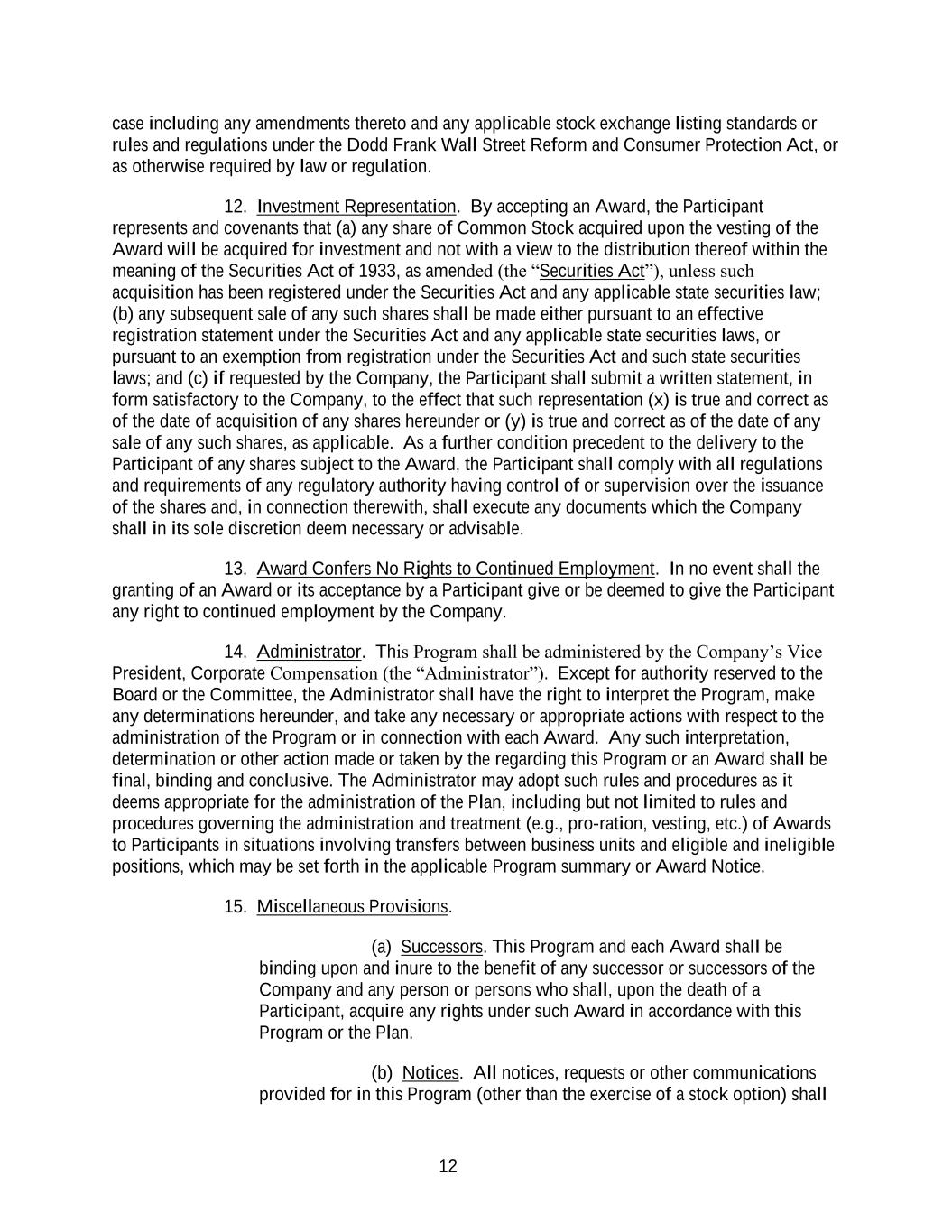 12 case including any amendments thereto and any applicable stock exchange listing standards or rules and regulations under the Dodd Frank Wall Street Reform and Consumer Protection Act, or as otherwise required by law or regulation. 12. Investment Representation. By accepting an Award, the Participant represents and covenants that (a) any share of Common Stock acquired upon the vesting of the Award will be acquired for investment and not with a view to the distribution thereof within the meaning of the Securities Act of 1933, as amended (the “Securities Act”), unless such acquisition has been registered under the Securities Act and any applicable state securities law; (b) any subsequent sale of any such shares shall be made either pursuant to an effective registration statement under the Securities Act and any applicable state securities laws, or pursuant to an exemption from registration under the Securities Act and such state securities laws; and (c) if requested by the Company, the Participant shall submit a written statement, in form satisfactory to the Company, to the effect that such representation (x) is true and correct as of the date of acquisition of any shares hereunder or (y) is true and correct as of the date of any sale of any such shares, as applicable. As a further condition precedent to the delivery to the Participant of any shares subject to the Award, the Participant shall comply with all regulations and requirements of any regulatory authority having control of or supervision over the issuance of the shares and, in connection therewith, shall execute any documents which the Company shall in its sole discretion deem necessary or advisable. 13. Award Confers No Rights to Continued Employment. In no event shall the granting of an Award or its acceptance by a Participant give or be deemed to give the Participant any right to continued employment by the Company. 14. Administrator. This Program shall be administered by the Company’s Vice President, Corporate Compensation (the “Administrator”). Except for authority reserved to the Board or the Committee, the Administrator shall have the right to interpret the Program, make any determinations hereunder, and take any necessary or appropriate actions with respect to the administration of the Program or in connection with each Award. Any such interpretation, determination or other action made or taken by the regarding this Program or an Award shall be final, binding and conclusive. The Administrator may adopt such rules and procedures as it deems appropriate for the administration of the Plan, including but not limited to rules and procedures governing the administration and treatment (e.g., pro-ration, vesting, etc.) of Awards to Participants in situations involving transfers between business units and eligible and ineligible positions, which may be set forth in the applicable Program summary or Award Notice. 15. Miscellaneous Provisions. (a) Successors. This Program and each Award shall be binding upon and inure to the benefit of any successor or successors of the Company and any person or persons who shall, upon the death of a Participant, acquire any rights under such Award in accordance with this Program or the Plan. (b) Notices. All notices, requests or other communications provided for in this Program (other than the exercise of a stock option) shall