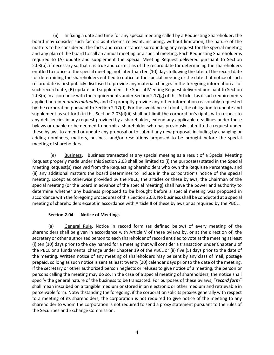 2 in all respects with this Section 2.03. Except as otherwise required by law, notice of the special meeting shall be given in accordance with Section 2.04 of the corporation’s amended and restated bylaws (as may be further amended from time in accordance with their terms, these “bylaws”). (b) Form of Request; Revocation. To be in proper form, any request or requests for a special meeting pursuant to Section 2.03(a)(ii) above (each, a “Special Meeting Request”) (i) must be delivered in accordance with Section 2.03(a)(ii) by one or more Requesting Shareholders who (A) at the time each Special Meeting Request is delivered, owns, or is a duly authorized agent of persons who own, the Requisite Percentage; (B) shall not have revoked such Special Meeting Request; and (C) shall continue to own not less than the Requisite Percentage through the date of the special meeting; (ii) must provide a statement of the specific purpose or purposes of the special meeting, the matter(s) proposed to be acted on at the special meeting, the reasons for conducting such business at the special meeting and any material interest in such business of each Requesting Shareholder or any Shareholder Associated Person (as defined below in Section 2.17(g)(6)) of such Requesting Shareholder; (iii) must contain a representation that each Requesting Shareholder, or one or more representatives of each such Requesting Shareholder, intends to appear in person or by proxy at the special meeting to present the proposal(s) or business to be brought before the special meeting; (iv) must contain (A) such information, statements, representations, agreements and other documents required by these bylaws as though such Requesting Shareholders are intending to nominate a candidate for director or propose other business to be brought before an annual meeting of shareholders pursuant to Section 2.17(c) of this Article II, and (B) without limitation of the foregoing clause (A), the text of such proposal(s) or business (including the complete text of any resolutions proposed for consideration and, in the event that such business includes a proposal to amend the corporation’s amended and restated articles of incorporation (as may be further amended in accordance with their terms, the “articles”) or these bylaws, the language of the proposed amendment); (v) must contain (A) an agreement by the Requesting Shareholders to notify the corporation promptly in the event of any disposition following the date of the Special Meeting Request of shares of common stock of the corporation owned by the Requesting Shareholders, and (B) an acknowledgment that any such disposition prior to the date of the special meeting shall be deemed to be a revocation of such Special Meeting Request with respect to such disposed shares and that such shares will no longer be included in determining whether the Requisite Percentage has been satisfied; and (vi) must provide documentary evidence that, at the time the Special Meeting Request is delivered to, and received by, the secretary, the Requesting Shareholders own the Requisite Percentage; provided, however, that if the Requesting Shareholders are not the beneficial owners of the shares representing the Requisite Percentage, then to be valid, the Special Meeting Request must also include documentary evidence that the beneficial owners on whose behalf the Special Meeting Request is made beneficially own the Requisite Percentage at the time such Special Meeting Request is delivered to the secretary (or, such evidence must be delivered to, and received by, the secretary within ten (10) days after the delivery of the Special Meeting Request). In determining whether a Special Meeting Request has been properly made in accordance with Section 2.03(a)(ii), multiple Special Meeting Requests delivered to the secretary will be considered together only if (x) each Special Meeting Request identifies substantially the same purpose or purposes of the special meeting and substantially the same matters proposed to be acted on at such meeting (in each case, as determined in good faith by the board) (which, if such purpose is the election or removal of directors, changing the size of the board and filling of vacancies and/or newly created directorships resulting from any increase in the authorized number of directors, will mean that the exact same person or persons are proposed for election or removal in each relevant Special Meeting Request), and (y) such