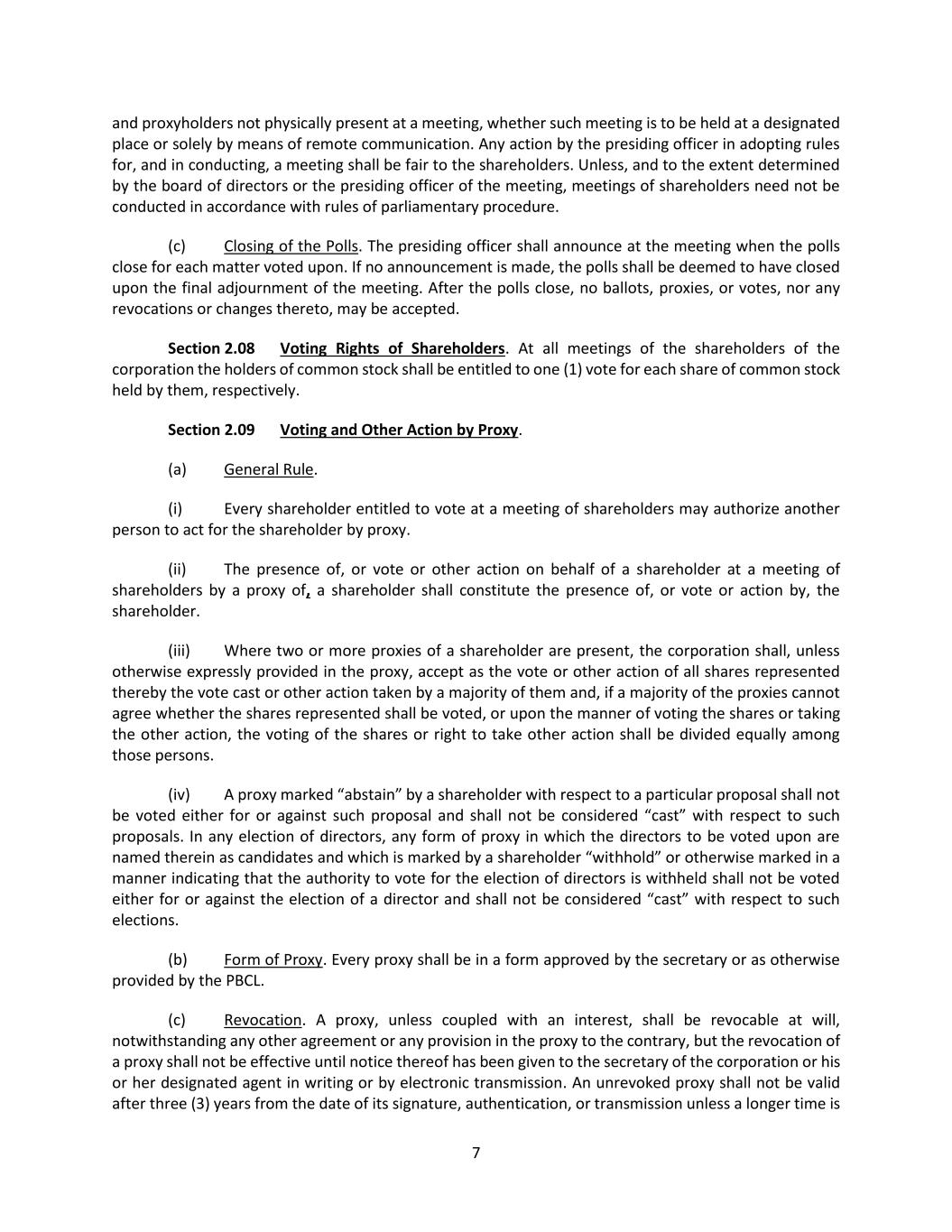 7 and proxyholders not physically present at a meeting, whether such meeting is to be held at a designated place or solely by means of remote communication. Any action by the presiding officer in adopting rules for, and in conducting, a meeting shall be fair to the shareholders. Unless, and to the extent determined by the board of directors or the presiding officer of the meeting, meetings of shareholders need not be conducted in accordance with rules of parliamentary procedure. (c) Closing of the Polls. The presiding officer shall announce at the meeting when the polls close for each matter voted upon. If no announcement is made, the polls shall be deemed to have closed upon the final adjournment of the meeting. After the polls close, no ballots, proxies, or votes, nor any revocations or changes thereto, may be accepted. Section 2.08 Voting Rights of Shareholders. At all meetings of the shareholders of the corporation the holders of common stock shall be entitled to one (1) vote for each share of common stock held by them, respectively. Section 2.09 Voting and Other Action by Proxy. (a) General Rule. (i) Every shareholder entitled to vote at a meeting of shareholders may authorize another person to act for the shareholder by proxy. (ii) The presence of, or vote or other action on behalf of a shareholder at a meeting of shareholders by a proxy of, a shareholder shall constitute the presence of, or vote or action by, the shareholder. (iii) Where two or more proxies of a shareholder are present, the corporation shall, unless otherwise expressly provided in the proxy, accept as the vote or other action of all shares represented thereby the vote cast or other action taken by a majority of them and, if a majority of the proxies cannot agree whether the shares represented shall be voted, or upon the manner of voting the shares or taking the other action, the voting of the shares or right to take other action shall be divided equally among those persons. (iv) A proxy marked “abstain” by a shareholder with respect to a particular proposal shall not be voted either for or against such proposal and shall not be considered “cast” with respect to such proposals. In any election of directors, any form of proxy in which the directors to be voted upon are named therein as candidates and which is marked by a shareholder “withhold” or otherwise marked in a manner indicating that the authority to vote for the election of directors is withheld shall not be voted either for or against the election of a director and shall not be considered “cast” with respect to such elections. (b) Form of Proxy. Every proxy shall be in a form approved by the secretary or as otherwise provided by the PBCL. (c) Revocation. A proxy, unless coupled with an interest, shall be revocable at will, notwithstanding any other agreement or any provision in the proxy to the contrary, but the revocation of a proxy shall not be effective until notice thereof has been given to the secretary of the corporation or his or her designated agent in writing or by electronic transmission. An unrevoked proxy shall not be valid after three (3) years from the date of its signature, authentication, or transmission unless a longer time is