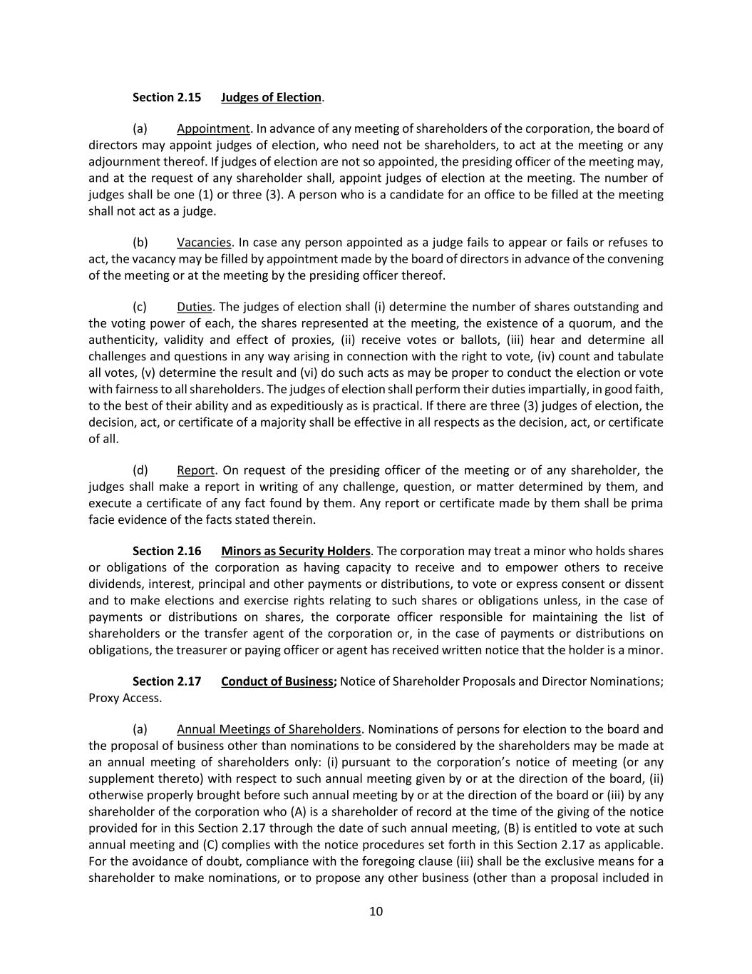10 Section 2.15 Judges of Election. (a) Appointment. In advance of any meeting of shareholders of the corporation, the board of directors may appoint judges of election, who need not be shareholders, to act at the meeting or any adjournment thereof. If judges of election are not so appointed, the presiding officer of the meeting may, and at the request of any shareholder shall, appoint judges of election at the meeting. The number of judges shall be one (1) or three (3). A person who is a candidate for an office to be filled at the meeting shall not act as a judge. (b) Vacancies. In case any person appointed as a judge fails to appear or fails or refuses to act, the vacancy may be filled by appointment made by the board of directors in advance of the convening of the meeting or at the meeting by the presiding officer thereof. (c) Duties. The judges of election shall (i) determine the number of shares outstanding and the voting power of each, the shares represented at the meeting, the existence of a quorum, and the authenticity, validity and effect of proxies, (ii) receive votes or ballots, (iii) hear and determine all challenges and questions in any way arising in connection with the right to vote, (iv) count and tabulate all votes, (v) determine the result and (vi) do such acts as may be proper to conduct the election or vote with fairness to all shareholders. The judges of election shall perform their duties impartially, in good faith, to the best of their ability and as expeditiously as is practical. If there are three (3) judges of election, the decision, act, or certificate of a majority shall be effective in all respects as the decision, act, or certificate of all. (d) Report. On request of the presiding officer of the meeting or of any shareholder, the judges shall make a report in writing of any challenge, question, or matter determined by them, and execute a certificate of any fact found by them. Any report or certificate made by them shall be prima facie evidence of the facts stated therein. Section 2.16 Minors as Security Holders. The corporation may treat a minor who holds shares or obligations of the corporation as having capacity to receive and to empower others to receive dividends, interest, principal and other payments or distributions, to vote or express consent or dissent and to make elections and exercise rights relating to such shares or obligations unless, in the case of payments or distributions on shares, the corporate officer responsible for maintaining the list of shareholders or the transfer agent of the corporation or, in the case of payments or distributions on obligations, the treasurer or paying officer or agent has received written notice that the holder is a minor. Section 2.17 Conduct of Business; Notice of Shareholder Proposals and Director Nominations; Proxy Access. (a) Annual Meetings of Shareholders. Nominations of persons for election to the board and the proposal of business other than nominations to be considered by the shareholders may be made at an annual meeting of shareholders only: (i) pursuant to the corporation’s notice of meeting (or any supplement thereto) with respect to such annual meeting given by or at the direction of the board, (ii) otherwise properly brought before such annual meeting by or at the direction of the board or (iii) by any shareholder of the corporation who (A) is a shareholder of record at the time of the giving of the notice provided for in this Section 2.17 through the date of such annual meeting, (B) is entitled to vote at such annual meeting and (C) complies with the notice procedures set forth in this Section 2.17 as applicable. For the avoidance of doubt, compliance with the foregoing clause (iii) shall be the exclusive means for a shareholder to make nominations, or to propose any other business (other than a proposal included in