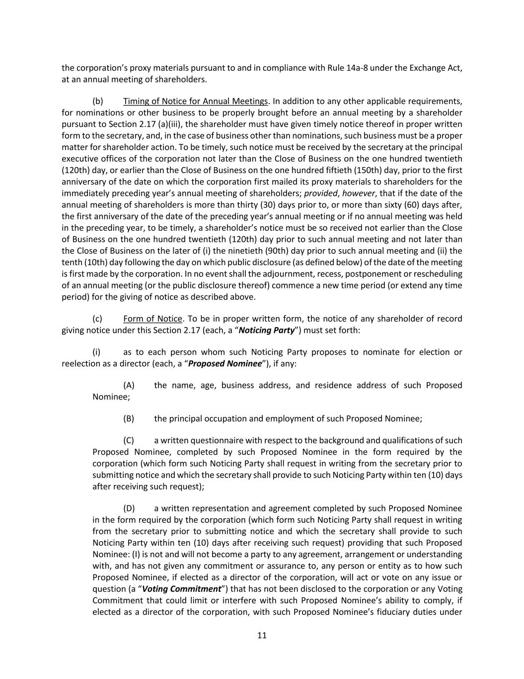 11 the corporation’s proxy materials pursuant to and in compliance with Rule 14a-8 under the Exchange Act, at an annual meeting of shareholders. (b) Timing of Notice for Annual Meetings. In addition to any other applicable requirements, for nominations or other business to be properly brought before an annual meeting by a shareholder pursuant to Section 2.17 (a)(iii), the shareholder must have given timely notice thereof in proper written form to the secretary, and, in the case of business other than nominations, such business must be a proper matter for shareholder action. To be timely, such notice must be received by the secretary at the principal executive offices of the corporation not later than the Close of Business on the one hundred twentieth (120th) day, or earlier than the Close of Business on the one hundred fiftieth (150th) day, prior to the first anniversary of the date on which the corporation first mailed its proxy materials to shareholders for the immediately preceding year’s annual meeting of shareholders; provided, however, that if the date of the annual meeting of shareholders is more than thirty (30) days prior to, or more than sixty (60) days after, the first anniversary of the date of the preceding year’s annual meeting or if no annual meeting was held in the preceding year, to be timely, a shareholder’s notice must be so received not earlier than the Close of Business on the one hundred twentieth (120th) day prior to such annual meeting and not later than the Close of Business on the later of (i) the ninetieth (90th) day prior to such annual meeting and (ii) the tenth (10th) day following the day on which public disclosure (as defined below) of the date of the meeting is first made by the corporation. In no event shall the adjournment, recess, postponement or rescheduling of an annual meeting (or the public disclosure thereof) commence a new time period (or extend any time period) for the giving of notice as described above. (c) Form of Notice. To be in proper written form, the notice of any shareholder of record giving notice under this Section 2.17 (each, a “Noticing Party”) must set forth: (i) as to each person whom such Noticing Party proposes to nominate for election or reelection as a director (each, a “Proposed Nominee”), if any: (A) the name, age, business address, and residence address of such Proposed Nominee; (B) the principal occupation and employment of such Proposed Nominee; (C) a written questionnaire with respect to the background and qualifications of such Proposed Nominee, completed by such Proposed Nominee in the form required by the corporation (which form such Noticing Party shall request in writing from the secretary prior to submitting notice and which the secretary shall provide to such Noticing Party within ten (10) days after receiving such request); (D) a written representation and agreement completed by such Proposed Nominee in the form required by the corporation (which form such Noticing Party shall request in writing from the secretary prior to submitting notice and which the secretary shall provide to such Noticing Party within ten (10) days after receiving such request) providing that such Proposed Nominee: (I) is not and will not become a party to any agreement, arrangement or understanding with, and has not given any commitment or assurance to, any person or entity as to how such Proposed Nominee, if elected as a director of the corporation, will act or vote on any issue or question (a “Voting Commitment”) that has not been disclosed to the corporation or any Voting Commitment that could limit or interfere with such Proposed Nominee’s ability to comply, if elected as a director of the corporation, with such Proposed Nominee’s fiduciary duties under