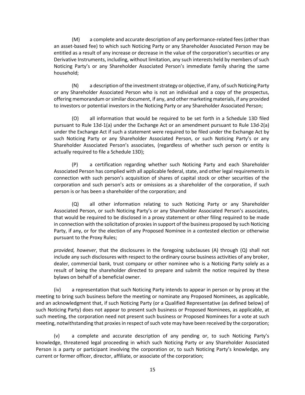 15 (M) a complete and accurate description of any performance-related fees (other than an asset-based fee) to which such Noticing Party or any Shareholder Associated Person may be entitled as a result of any increase or decrease in the value of the corporation’s securities or any Derivative Instruments, including, without limitation, any such interests held by members of such Noticing Party’s or any Shareholder Associated Person’s immediate family sharing the same household; (N) a description of the investment strategy or objective, if any, of such Noticing Party or any Shareholder Associated Person who is not an individual and a copy of the prospectus, offering memorandum or similar document, if any, and other marketing materials, if any provided to investors or potential investors in the Noticing Party or any Shareholder Associated Person; (O) all information that would be required to be set forth in a Schedule 13D filed pursuant to Rule 13d-1(a) under the Exchange Act or an amendment pursuant to Rule 13d-2(a) under the Exchange Act if such a statement were required to be filed under the Exchange Act by such Noticing Party or any Shareholder Associated Person, or such Noticing Party’s or any Shareholder Associated Person’s associates, (regardless of whether such person or entity is actually required to file a Schedule 13D); (P) a certification regarding whether such Noticing Party and each Shareholder Associated Person has complied with all applicable federal, state, and other legal requirements in connection with such person’s acquisition of shares of capital stock or other securities of the corporation and such person’s acts or omissions as a shareholder of the corporation, if such person is or has been a shareholder of the corporation; and (Q) all other information relating to such Noticing Party or any Shareholder Associated Person, or such Noticing Party’s or any Shareholder Associated Person’s associates, that would be required to be disclosed in a proxy statement or other filing required to be made in connection with the solicitation of proxies in support of the business proposed by such Noticing Party, if any, or for the election of any Proposed Nominee in a contested election or otherwise pursuant to the Proxy Rules; provided, however, that the disclosures in the foregoing subclauses (A) through (Q) shall not include any such disclosures with respect to the ordinary course business activities of any broker, dealer, commercial bank, trust company or other nominee who is a Noticing Party solely as a result of being the shareholder directed to prepare and submit the notice required by these bylaws on behalf of a beneficial owner. (iv) a representation that such Noticing Party intends to appear in person or by proxy at the meeting to bring such business before the meeting or nominate any Proposed Nominees, as applicable, and an acknowledgment that, if such Noticing Party (or a Qualified Representative (as defined below) of such Noticing Party) does not appear to present such business or Proposed Nominees, as applicable, at such meeting, the corporation need not present such business or Proposed Nominees for a vote at such meeting, notwithstanding that proxies in respect of such vote may have been received by the corporation; (v) a complete and accurate description of any pending or, to such Noticing Party’s knowledge, threatened legal proceeding in which such Noticing Party or any Shareholder Associated Person is a party or participant involving the corporation or, to such Noticing Party’s knowledge, any current or former officer, director, affiliate, or associate of the corporation;