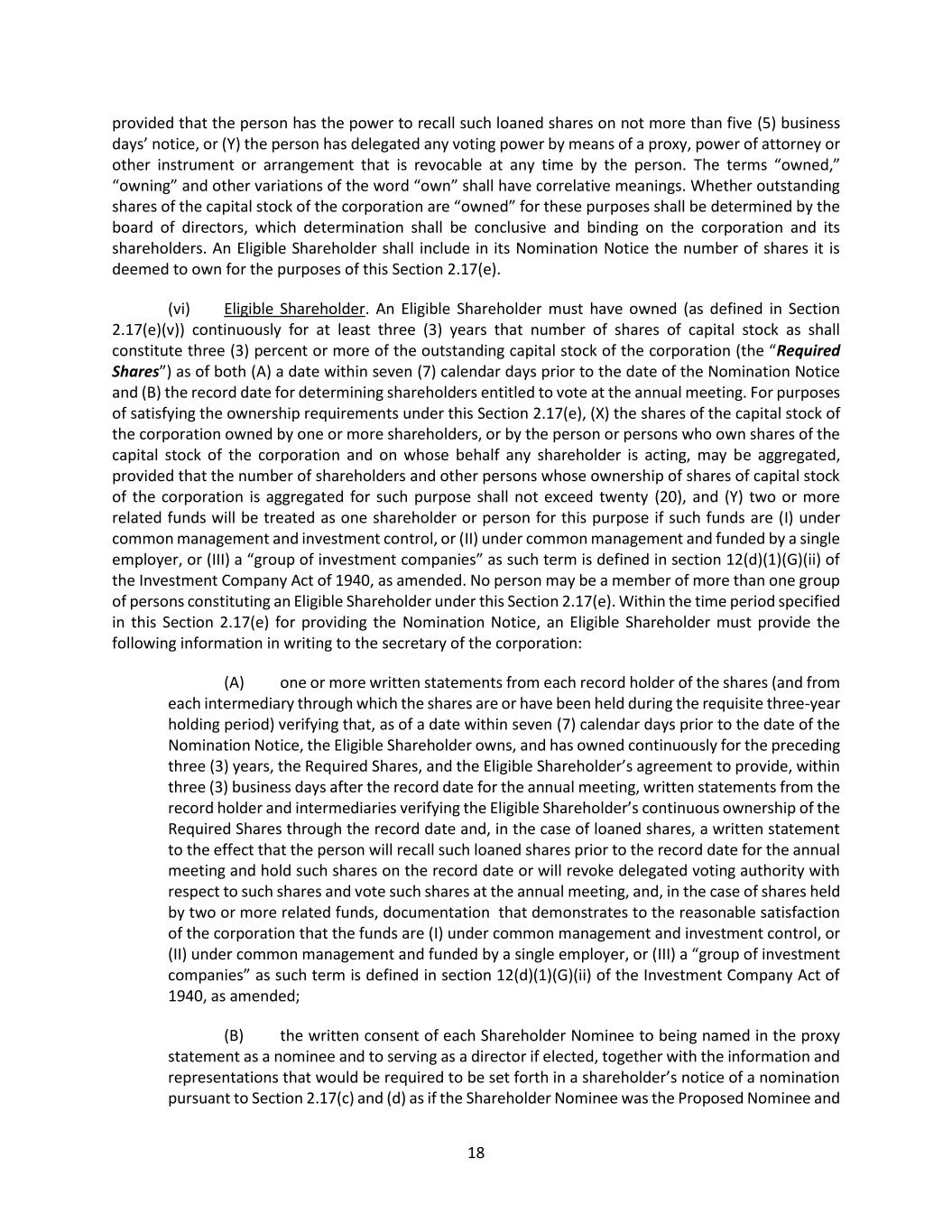 18 provided that the person has the power to recall such loaned shares on not more than five (5) business days’ notice, or (Y) the person has delegated any voting power by means of a proxy, power of attorney or other instrument or arrangement that is revocable at any time by the person. The terms “owned,” “owning” and other variations of the word “own” shall have correlative meanings. Whether outstanding shares of the capital stock of the corporation are “owned” for these purposes shall be determined by the board of directors, which determination shall be conclusive and binding on the corporation and its shareholders. An Eligible Shareholder shall include in its Nomination Notice the number of shares it is deemed to own for the purposes of this Section 2.17(e). (vi) Eligible Shareholder. An Eligible Shareholder must have owned (as defined in Section 2.17(e)(v)) continuously for at least three (3) years that number of shares of capital stock as shall constitute three (3) percent or more of the outstanding capital stock of the corporation (the “Required Shares”) as of both (A) a date within seven (7) calendar days prior to the date of the Nomination Notice and (B) the record date for determining shareholders entitled to vote at the annual meeting. For purposes of satisfying the ownership requirements under this Section 2.17(e), (X) the shares of the capital stock of the corporation owned by one or more shareholders, or by the person or persons who own shares of the capital stock of the corporation and on whose behalf any shareholder is acting, may be aggregated, provided that the number of shareholders and other persons whose ownership of shares of capital stock of the corporation is aggregated for such purpose shall not exceed twenty (20), and (Y) two or more related funds will be treated as one shareholder or person for this purpose if such funds are (I) under common management and investment control, or (II) under common management and funded by a single employer, or (III) a “group of investment companies” as such term is defined in section 12(d)(1)(G)(ii) of the Investment Company Act of 1940, as amended. No person may be a member of more than one group of persons constituting an Eligible Shareholder under this Section 2.17(e). Within the time period specified in this Section 2.17(e) for providing the Nomination Notice, an Eligible Shareholder must provide the following information in writing to the secretary of the corporation: (A) one or more written statements from each record holder of the shares (and from each intermediary through which the shares are or have been held during the requisite three-year holding period) verifying that, as of a date within seven (7) calendar days prior to the date of the Nomination Notice, the Eligible Shareholder owns, and has owned continuously for the preceding three (3) years, the Required Shares, and the Eligible Shareholder’s agreement to provide, within three (3) business days after the record date for the annual meeting, written statements from the record holder and intermediaries verifying the Eligible Shareholder’s continuous ownership of the Required Shares through the record date and, in the case of loaned shares, a written statement to the effect that the person will recall such loaned shares prior to the record date for the annual meeting and hold such shares on the record date or will revoke delegated voting authority with respect to such shares and vote such shares at the annual meeting, and, in the case of shares held by two or more related funds, documentation that demonstrates to the reasonable satisfaction of the corporation that the funds are (I) under common management and investment control, or (II) under common management and funded by a single employer, or (III) a “group of investment companies” as such term is defined in section 12(d)(1)(G)(ii) of the Investment Company Act of 1940, as amended; (B) the written consent of each Shareholder Nominee to being named in the proxy statement as a nominee and to serving as a director if elected, together with the information and representations that would be required to be set forth in a shareholder’s notice of a nomination pursuant to Section 2.17(c) and (d) as if the Shareholder Nominee was the Proposed Nominee and