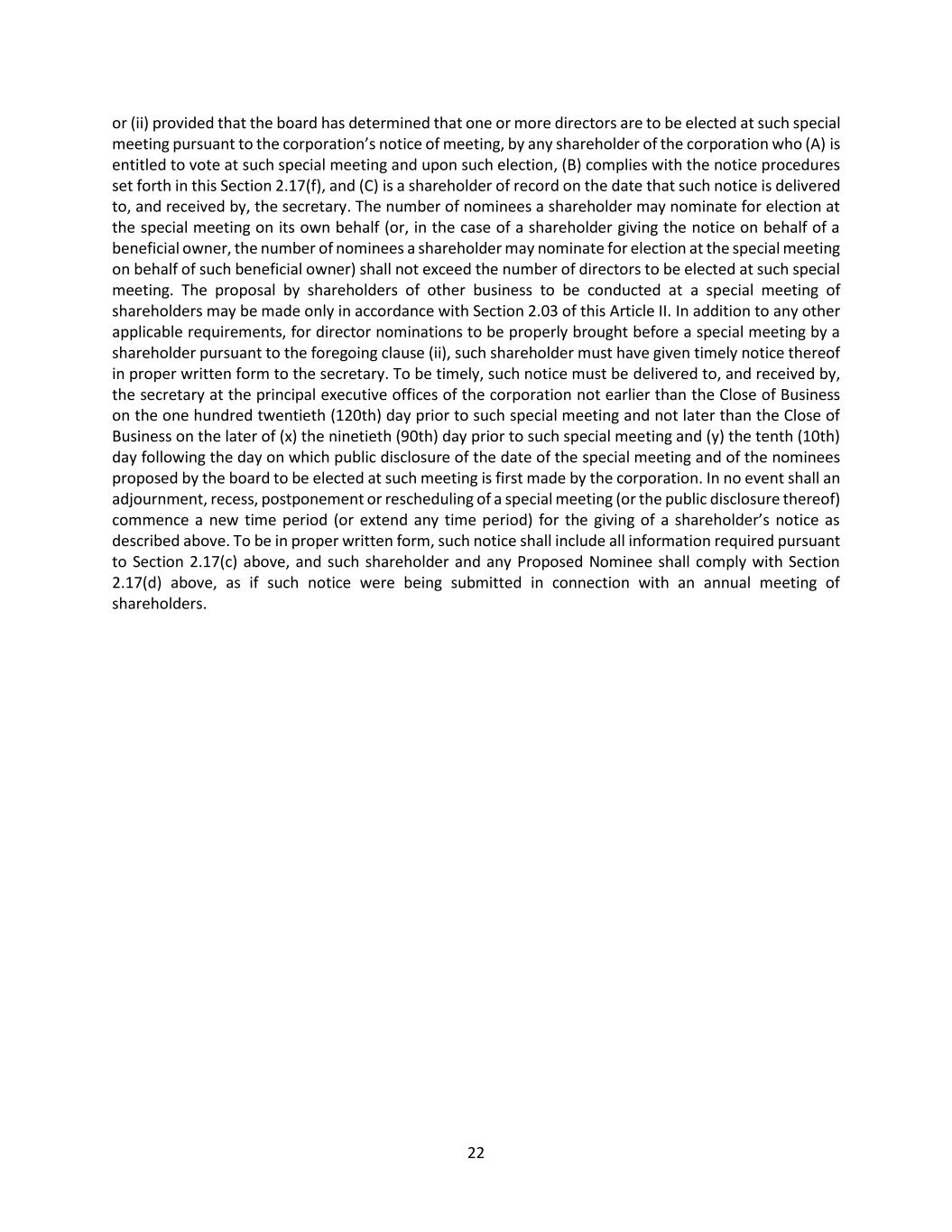 22 or (ii) provided that the board has determined that one or more directors are to be elected at such special meeting pursuant to the corporation’s notice of meeting, by any shareholder of the corporation who (A) is entitled to vote at such special meeting and upon such election, (B) complies with the notice procedures set forth in this Section 2.17(f), and (C) is a shareholder of record on the date that such notice is delivered to, and received by, the secretary. The number of nominees a shareholder may nominate for election at the special meeting on its own behalf (or, in the case of a shareholder giving the notice on behalf of a beneficial owner, the number of nominees a shareholder may nominate for election at the special meeting on behalf of such beneficial owner) shall not exceed the number of directors to be elected at such special meeting. The proposal by shareholders of other business to be conducted at a special meeting of shareholders may be made only in accordance with Section 2.03 of this Article II. In addition to any other applicable requirements, for director nominations to be properly brought before a special meeting by a shareholder pursuant to the foregoing clause (ii), such shareholder must have given timely notice thereof in proper written form to the secretary. To be timely, such notice must be delivered to, and received by, the secretary at the principal executive offices of the corporation not earlier than the Close of Business on the one hundred twentieth (120th) day prior to such special meeting and not later than the Close of Business on the later of (x) the ninetieth (90th) day prior to such special meeting and (y) the tenth (10th) day following the day on which public disclosure of the date of the special meeting and of the nominees proposed by the board to be elected at such meeting is first made by the corporation. In no event shall an adjournment, recess, postponement or rescheduling of a special meeting (or the public disclosure thereof) commence a new time period (or extend any time period) for the giving of a shareholder’s notice as described above. To be in proper written form, such notice shall include all information required pursuant to Section 2.17(c) above, and such shareholder and any Proposed Nominee shall comply with Section 2.17(d) above, as if such notice were being submitted in connection with an annual meeting of shareholders.