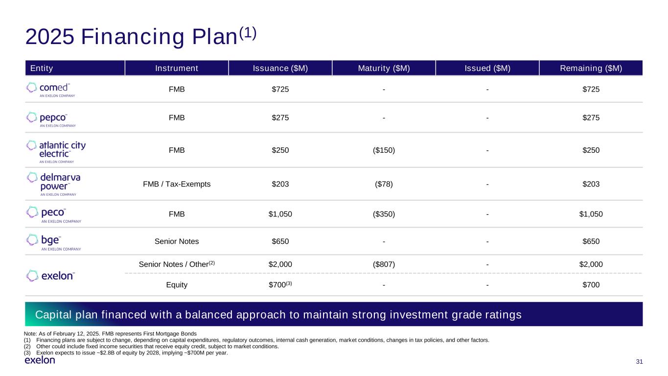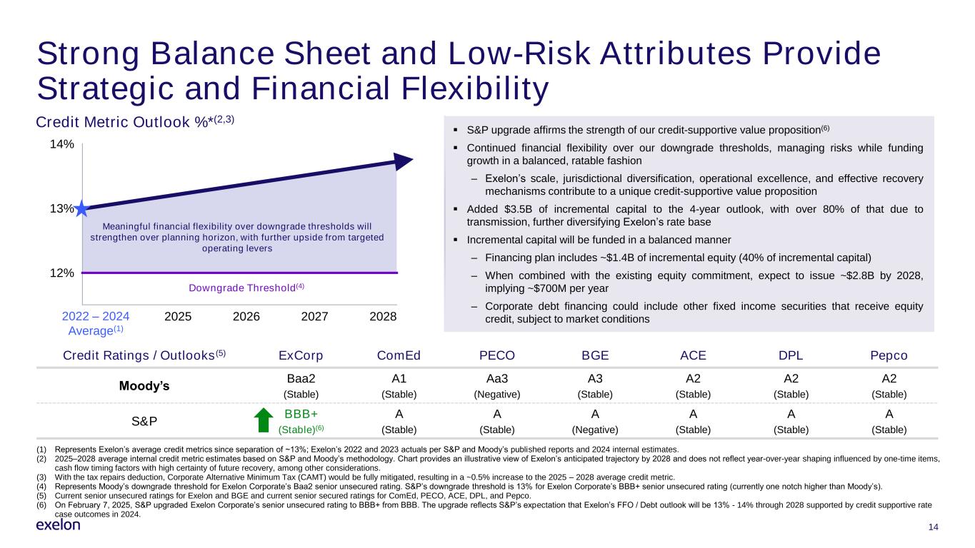 ▪ S&P upgrade affirms the strength of our credit-supportive value proposition(6) ▪ Continued financial flexibility over our downgrade thresholds, managing risks while funding growth in a balanced, ratable fashion – Exelon’s scale, jurisdictional diversification, operational excellence, and effective recovery mechanisms contribute to a unique credit-supportive value proposition ▪ Added $3.5B of incremental capital to the 4-year outlook, with over 80% of that due to transmission, further diversifying Exelon’s rate base ▪ Incremental capital will be funded in a balanced manner – Financing plan includes ~$1.4B of incremental equity (40% of incremental capital) – When combined with the existing equity commitment, expect to issue ~$2.8B by 2028, implying ~$700M per year – Corporate debt financing could include other fixed income securities that receive equity credit, subject to market conditions Strong Balance Sheet and Low-Risk Attributes Provide Strategic and Financial Flexibility Credit Metric Outlook %*(2,3) Credit Ratings / Outlooks(5) ExCorp ComEd PECO BGE ACE DPL Pepco Moody’s Baa2 (Stable) A1 (Stable) Aa3 (Negative) A3 (Stable) A2 (Stable) A2 (Stable) A2 (Stable) S&P BBB+ (Stable)(6) A (Stable) A (Stable) A (Negative) A (Stable) A (Stable) A (Stable) (1) Represents Exelon’s average credit metrics since separation of ~13%; Exelon’s 2022 and 2023 actuals per S&P and Moody’s published reports and 2024 internal estimates. (2) 2025–2028 average internal credit metric estimates based on S&P and Moody’s methodology. Chart provides an illustrative view of Exelon’s anticipated trajectory by 2028 and does not reflect year-over-year shaping influenced by one-time items, cash flow timing factors with high certainty of future recovery, among other considerations. (3) With the tax repairs deduction, Corporate Alternative Minimum Tax (CAMT) would be fully mitigated, resulting in a ~0.5% increase to the 2025 – 2028 average credit metric. (4) Represents Moody’s downgrade threshold for Exelon Corporate’s Baa2 senior unsecured rating. S&P’s downgrade threshold is 13% for Exelon Corporate’s BBB+ senior unsecured rating (currently one notch higher than Moody’s). (5) Current senior unsecured ratings for Exelon and BGE and current senior secured ratings for ComEd, PECO, ACE, DPL, and Pepco. (6) On February 7, 2025, S&P upgraded Exelon Corporate’s senior unsecured rating to BBB+ from BBB. The upgrade reflects S&P’s expectation that Exelon’s FFO / Debt outlook will be 13% - 14% through 2028 supported by credit supportive rate case outcomes in 2024. 12% 13% 14% 2022 – 2024 Average(1) 2025 2026 2027 2028 Meaningful financial flexibility over downgrade thresholds will strengthen over planning horizon, with further upside from targeted operating levers Downgrade Threshold(4) 14
