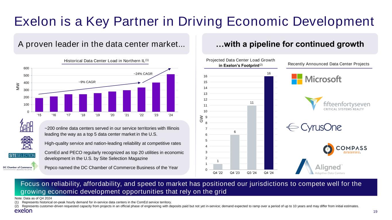 19 Focus on reliability, affordability, and speed to market has positioned our jurisdictions to compete well for the growing economic development opportunities that rely on the grid Exelon is a Key Partner in Driving Economic Development 1 6 11 16 0 1 2 3 4 5 6 7 8 9 10 11 12 13 14 15 16 Q4 ’22 Q4 ’23 Q3 ’24 Q4 ’24 0 100 200 300 400 500 600 ‘15 ‘16 ‘17 ‘18 ‘19 ‘20 ‘21 ‘22 ‘23 ‘24 ~9% CAGR ~24% CAGR Historical Data Center Load in Northern IL(1) M W Projected Data Center Load Growth in Exelon’s Footprint(2) G W Note: Data as of Q4 2024 (1) Represents historical on-peak hourly demand for in-service data centers in the ComEd service territory. (2) Represents customer-driven requested capacity from projects in an official phase of engineering with deposits paid but not yet in-service; demand expected to ramp over a period of up to 10 years and may differ from initial estimates. Recently Announced Data Center Projects A proven leader in the data center market... …with a pipeline for continued growth ~200 online data centers served in our service territories with Illinois leading the way as a top 5 data center market in the U.S. High-quality service and nation-leading reliability at competitive rates ComEd and PECO regularly recognized as top 20 utilities in economic development in the U.S. by Site Selection Magazine Pepco named the DC Chamber of Commerce Business of the Year