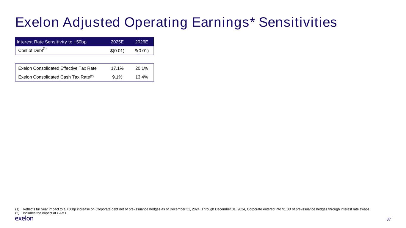 37 Exelon Adjusted Operating Earnings* Sensitivities Interest Rate Sensitivity to +50bp 2025E 2026E Cost of Debt (1) $(0.01) $(0.01) Exelon Consolidated Effective Tax Rate 17.1% 20.1% Exelon Consolidated Cash Tax Rate(2) 9.1% 13.4% (1) Reflects full year impact to a +50bp increase on Corporate debt net of pre-issuance hedges as of December 31, 2024. Through December 31, 2024, Corporate entered into $1.3B of pre-issuance hedges through interest rate swaps. (2) Includes the impact of CAMT.