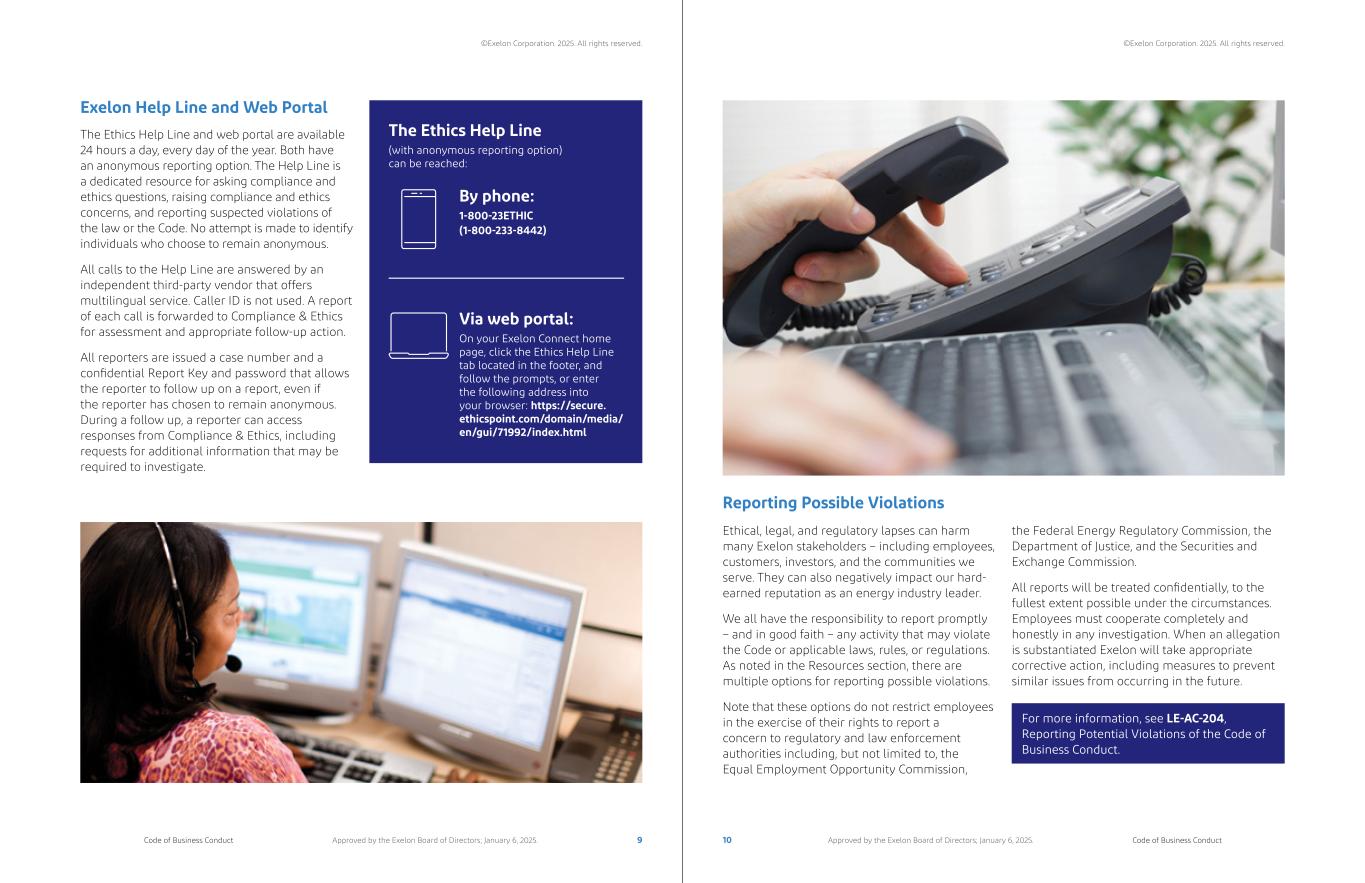 Exelon Help Line and Web Portal The Ethics Help Line and web portal are available 24 hours a day, every day of the year. Both have an anonymous reporting option. The Help Line is a dedicated resource for asking compliance and ethics questions, raising compliance and ethics concerns, and reporting suspected violations of the law or the Code. No attempt is made to identify individuals who choose to remain anonymous. All calls to the Help Line are answered by an independent third-party vendor that offers multilingual service. Caller ID is not used. A report of each call is forwarded to Compliance & Ethics for assessment and appropriate follow-up action. All reporters are issued a case number and a confidential Report Key and password that allows the reporter to follow up on a report, even if the reporter has chosen to remain anonymous. During a follow up, a reporter can access responses from Compliance & Ethics, including requests for additional information that may be required to investigate. Ethical, legal, and regulatory lapses can harm many Exelon stakeholders – including employees, customers, investors, and the communities we serve. They can also negatively impact our hard- earned reputation as an energy industry leader. We all have the responsibility to report promptly – and in good faith – any activity that may violate the Code or applicable laws, rules, or regulations. As noted in the Resources section, there are multiple options for reporting possible violations. Note that these options do not restrict employees in the exercise of their rights to report a concern to regulatory and law enforcement authorities including, but not limited to, the Equal Employment Opportunity Commission, The Ethics Help Line (with anonymous reporting option) can be reached: By phone: 1-800-23ETHIC (1-800-233-8442) Via web portal: On your Exelon Connect home page, click the Ethics Help Line tab located in the footer, and follow the prompts, or enter the following address into your browser: https://secure. ethicspoint.com/domain/media/ en/gui/71992/index.html Reporting Possible Violations the Federal Energy Regulatory Commission, the Department of Justice, and the Securities and Exchange Commission. All reports will be treated confidentially, to the fullest extent possible under the circumstances. Employees must cooperate completely and honestly in any investigation. When an allegation is substantiated Exelon will take appropriate corrective action, including measures to prevent similar issues from occurring in the future. For more information, see LE-AC-204, Reporting Potential Violations of the Code of Business Conduct. 9 10Code of Business Conduct Code of Business ConductApproved by the Exelon Board of Directors; January 6, 2025. Approved by the Exelon Board of Directors; January 6, 2025. ©Exelon Corporation. 2025. All rights reserved. ©Exelon Corporation. 2025. All rights reserved.