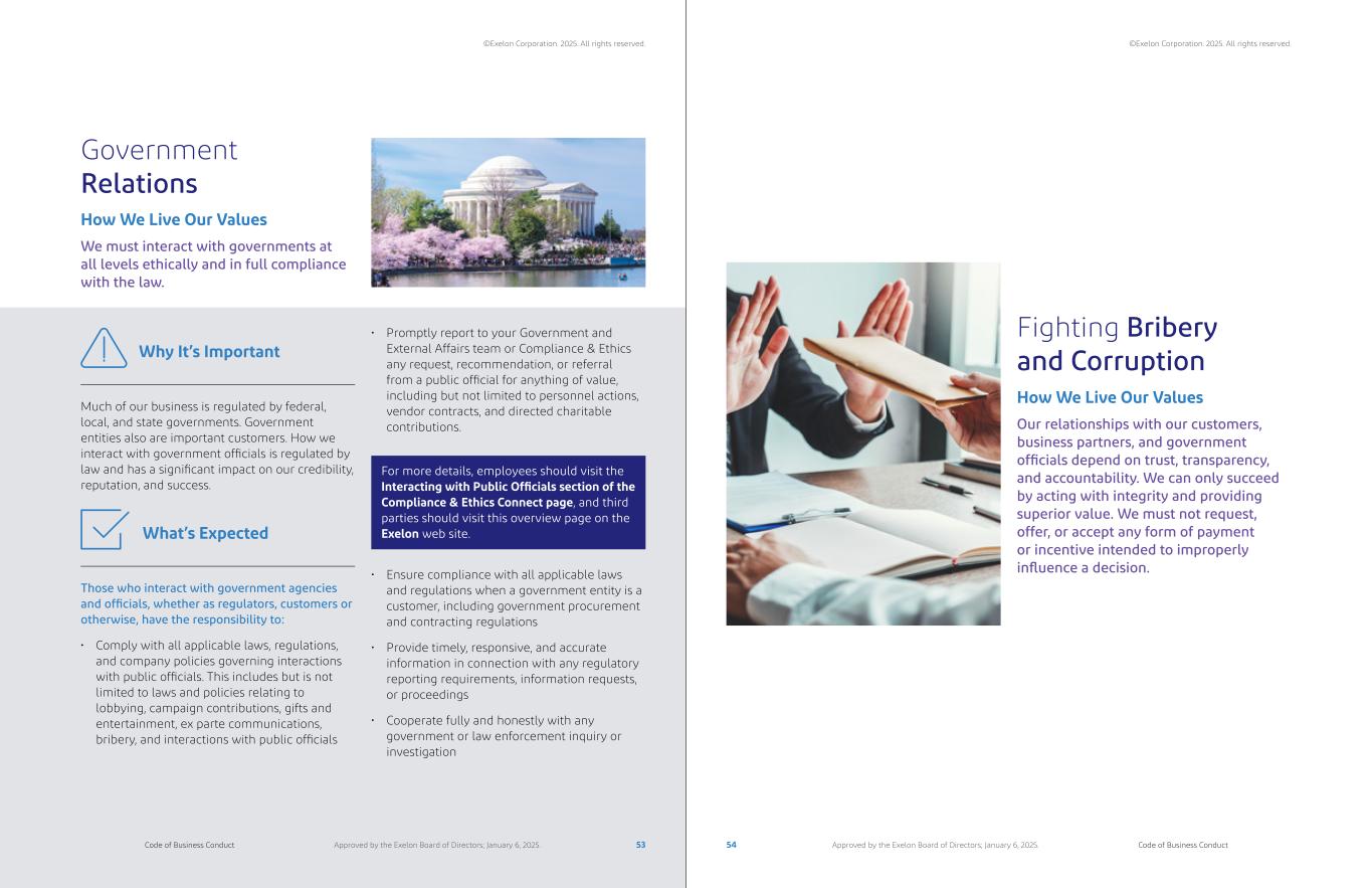 Government Relations Fighting Bribery and Corruption We must interact with governments at all levels ethically and in full compliance with the law. Our relationships with our customers, business partners, and government officials depend on trust, transparency, and accountability. We can only succeed by acting with integrity and providing superior value. We must not request, offer, or accept any form of payment or incentive intended to improperly influence a decision. How We Live Our Values How We Live Our Values Much of our business is regulated by federal, local, and state governments. Government entities also are important customers. How we interact with government officials is regulated by law and has a significant impact on our credibility, reputation, and success. Why It’s Important Those who interact with government agencies and officials, whether as regulators, customers or otherwise, have the responsibility to: • Comply with all applicable laws, regulations, and company policies governing interactions with public officials. This includes but is not limited to laws and policies relating to lobbying, campaign contributions, gifts and entertainment, ex parte communications, bribery, and interactions with public officials What’s Expected • Promptly report to your Government and External Affairs team or Compliance & Ethics any request, recommendation, or referral from a public official for anything of value, including but not limited to personnel actions, vendor contracts, and directed charitable contributions. For more details, employees should visit the Interacting with Public Officials section of the Compliance & Ethics Connect page, and third parties should visit this overview page on the Exelon web site. • Ensure compliance with all applicable laws and regulations when a government entity is a customer, including government procurement and contracting regulations • Provide timely, responsive, and accurate information in connection with any regulatory reporting requirements, information requests, or proceedings • Cooperate fully and honestly with any government or law enforcement inquiry or investigation 53 54Code of Business Conduct Code of Business ConductApproved by the Exelon Board of Directors; January 6, 2025. Approved by the Exelon Board of Directors; January 6, 2025. ©Exelon Corporation. 2025. All rights reserved. ©Exelon Corporation. 2025. All rights reserved.