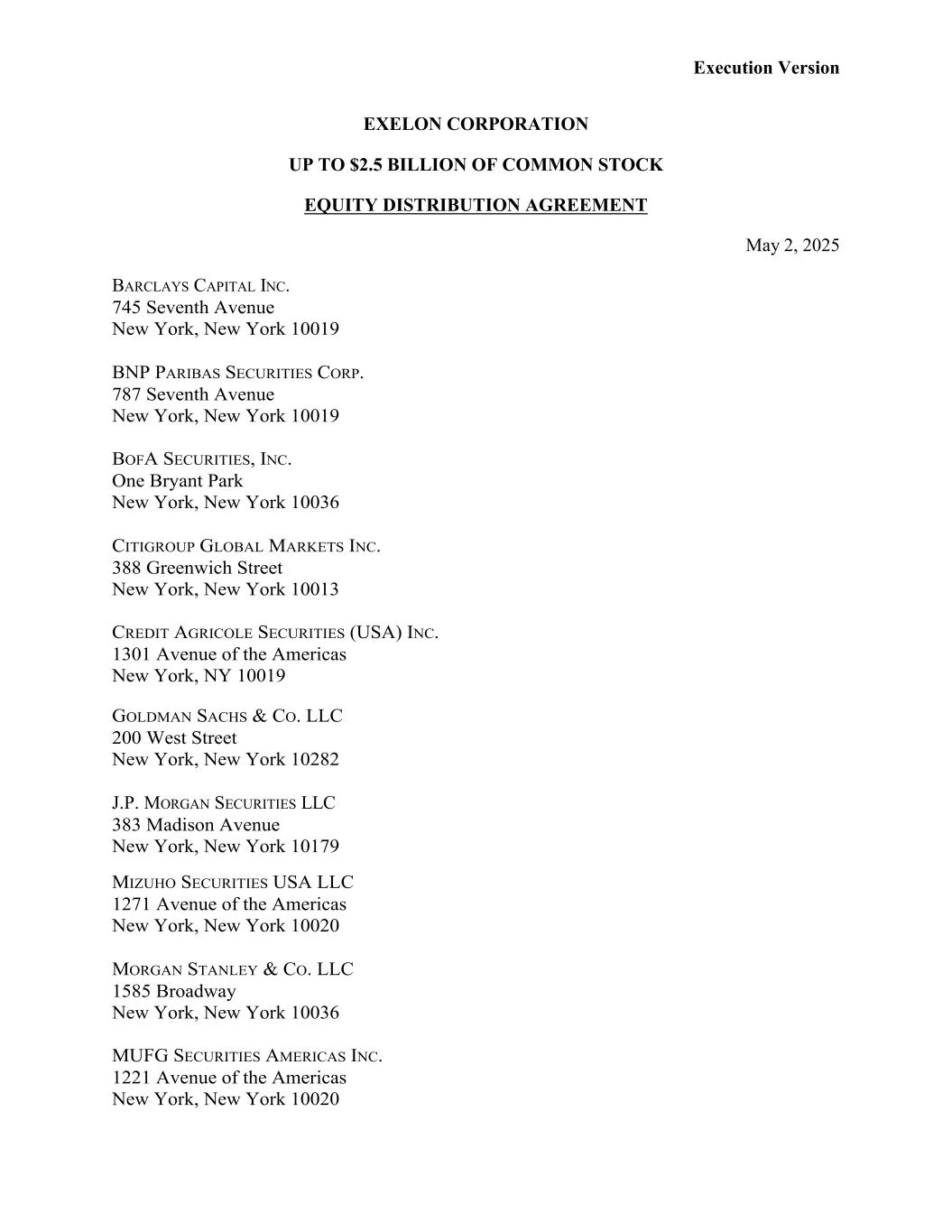 Execution Version EXELON CORPORATION UP TO $2.5 BILLION OF COMMON STOCK EQUITY DISTRIBUTION AGREEMENT May 2, 2025 BARCLAYS CAPITAL INC. 745 Seventh Avenue New York, New York 10019 BNP PARIBAS SECURITIES CORP. 787 Seventh Avenue New York, New York 10019 BOFA SECURITIES, INC. One Bryant Park New York, New York 10036 CITIGROUP GLOBAL MARKETS INC. 388 Greenwich Street New York, New York 10013 CREDIT AGRICOLE SECURITIES (USA) INC. 1301 Avenue of the Americas New York, NY 10019 GOLDMAN SACHS & CO. LLC 200 West Street New York, New York 10282 J.P. MORGAN SECURITIES LLC 383 Madison Avenue New York, New York 10179 MIZUHO SECURITIES USA LLC 1271 Avenue of the Americas New York, New York 10020 MORGAN STANLEY & CO. LLC 1585 Broadway New York, New York 10036 MUFG SECURITIES AMERICAS INC. 1221 Avenue of the Americas New York, New York 10020