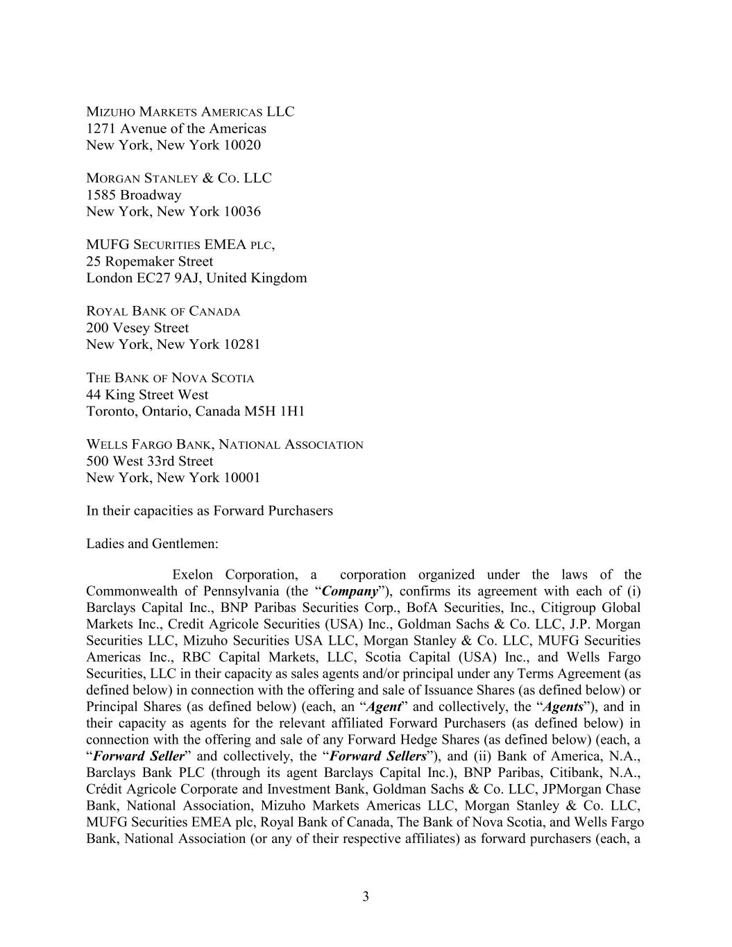 MIZUHO MARKETS AMERICAS LLC 1271 Avenue of the Americas New York, New York 10020 MORGAN STANLEY & CO. LLC 1585 Broadway New York, New York 10036 MUFG SECURITIES EMEA PLC, 25 Ropemaker Street London EC27 9AJ, United Kingdom ROYAL BANK OF CANADA 200 Vesey Street New York, New York 10281 THE BANK OF NOVA SCOTIA 44 King Street West Toronto, Ontario, Canada M5H 1H1 WELLS FARGO BANK, NATIONAL ASSOCIATION 500 West 33rd Street New York, New York 10001 In their capacities as Forward Purchasers Ladies and Gentlemen: Exelon Corporation, a corporation organized under the laws of the Commonwealth of Pennsylvania (the “Company”), confirms its agreement with each of (i) Barclays Capital Inc., BNP Paribas Securities Corp., BofA Securities, Inc., Citigroup Global Markets Inc., Credit Agricole Securities (USA) Inc., Goldman Sachs & Co. LLC, J.P. Morgan Securities LLC, Mizuho Securities USA LLC, Morgan Stanley & Co. LLC, MUFG Securities Americas Inc., RBC Capital Markets, LLC, Scotia Capital (USA) Inc., and Wells Fargo Securities, LLC in their capacity as sales agents and/or principal under any Terms Agreement (as defined below) in connection with the offering and sale of Issuance Shares (as defined below) or Principal Shares (as defined below) (each, an “Agent” and collectively, the “Agents”), and in their capacity as agents for the relevant affiliated Forward Purchasers (as defined below) in connection with the offering and sale of any Forward Hedge Shares (as defined below) (each, a “Forward Seller” and collectively, the “Forward Sellers”), and (ii) Bank of America, N.A., Barclays Bank PLC (through its agent Barclays Capital Inc.), BNP Paribas, Citibank, N.A., Crédit Agricole Corporate and Investment Bank, Goldman Sachs & Co. LLC, JPMorgan Chase Bank, National Association, Mizuho Markets Americas LLC, Morgan Stanley & Co. LLC, MUFG Securities EMEA plc, Royal Bank of Canada, The Bank of Nova Scotia, and Wells Fargo Bank, National Association (or any of their respective affiliates) as forward purchasers (each, a 3