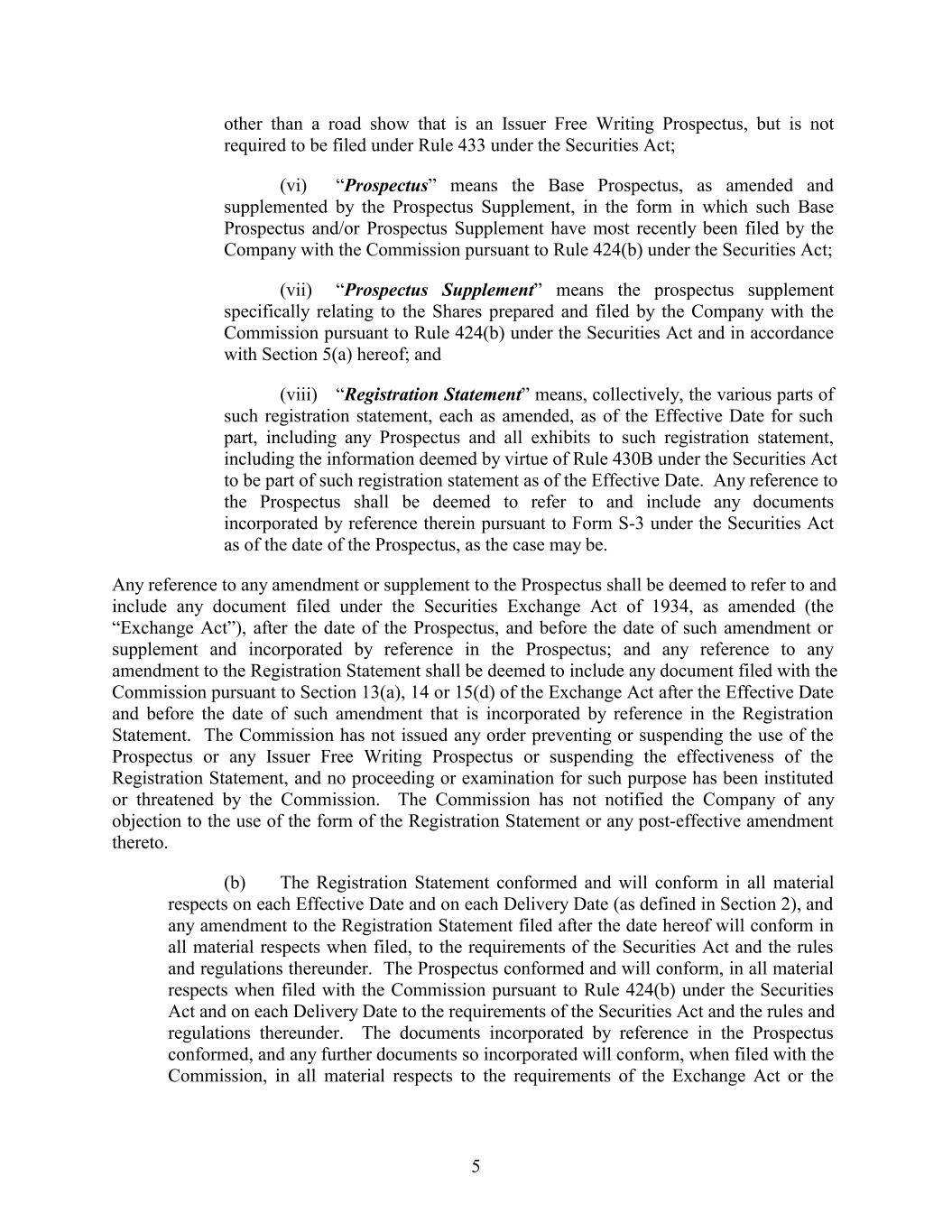 other than a road show that is an Issuer Free Writing Prospectus, but is not required to be filed under Rule 433 under the Securities Act; (vi) “Prospectus” means the Base Prospectus, as amended and supplemented by the Prospectus Supplement, in the form in which such Base Prospectus and/or Prospectus Supplement have most recently been filed by the Company with the Commission pursuant to Rule 424(b) under the Securities Act; (vii) “Prospectus Supplement” means the prospectus supplement specifically relating to the Shares prepared and filed by the Company with the Commission pursuant to Rule 424(b) under the Securities Act and in accordance with Section 5(a) hereof; and (viii) “Registration Statement” means, collectively, the various parts of such registration statement, each as amended, as of the Effective Date for such part, including any Prospectus and all exhibits to such registration statement, including the information deemed by virtue of Rule 430B under the Securities Act to be part of such registration statement as of the Effective Date. Any reference to the Prospectus shall be deemed to refer to and include any documents incorporated by reference therein pursuant to Form S-3 under the Securities Act as of the date of the Prospectus, as the case may be. Any reference to any amendment or supplement to the Prospectus shall be deemed to refer to and include any document filed under the Securities Exchange Act of 1934, as amended (the “Exchange Act”), after the date of the Prospectus, and before the date of such amendment or supplement and incorporated by reference in the Prospectus; and any reference to any amendment to the Registration Statement shall be deemed to include any document filed with the Commission pursuant to Section 13(a), 14 or 15(d) of the Exchange Act after the Effective Date and before the date of such amendment that is incorporated by reference in the Registration Statement. The Commission has not issued any order preventing or suspending the use of the Prospectus or any Issuer Free Writing Prospectus or suspending the effectiveness of the Registration Statement, and no proceeding or examination for such purpose has been instituted or threatened by the Commission. The Commission has not notified the Company of any objection to the use of the form of the Registration Statement or any post-effective amendment thereto. (b) The Registration Statement conformed and will conform in all material respects on each Effective Date and on each Delivery Date (as defined in Section 2), and any amendment to the Registration Statement filed after the date hereof will conform in all material respects when filed, to the requirements of the Securities Act and the rules and regulations thereunder. The Prospectus conformed and will conform, in all material respects when filed with the Commission pursuant to Rule 424(b) under the Securities Act and on each Delivery Date to the requirements of the Securities Act and the rules and regulations thereunder. The documents incorporated by reference in the Prospectus conformed, and any further documents so incorporated will conform, when filed with the Commission, in all material respects to the requirements of the Exchange Act or the 5