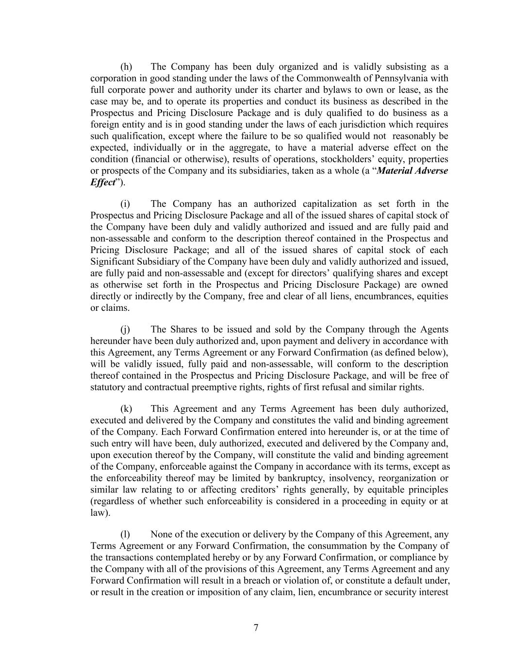 (h) The Company has been duly organized and is validly subsisting as a corporation in good standing under the laws of the Commonwealth of Pennsylvania with full corporate power and authority under its charter and bylaws to own or lease, as the case may be, and to operate its properties and conduct its business as described in the Prospectus and Pricing Disclosure Package and is duly qualified to do business as a foreign entity and is in good standing under the laws of each jurisdiction which requires such qualification, except where the failure to be so qualified would not reasonably be expected, individually or in the aggregate, to have a material adverse effect on the condition (financial or otherwise), results of operations, stockholders’ equity, properties or prospects of the Company and its subsidiaries, taken as a whole (a “Material Adverse Effect”). (i) The Company has an authorized capitalization as set forth in the Prospectus and Pricing Disclosure Package and all of the issued shares of capital stock of the Company have been duly and validly authorized and issued and are fully paid and non-assessable and conform to the description thereof contained in the Prospectus and Pricing Disclosure Package; and all of the issued shares of capital stock of each Significant Subsidiary of the Company have been duly and validly authorized and issued, are fully paid and non-assessable and (except for directors’ qualifying shares and except as otherwise set forth in the Prospectus and Pricing Disclosure Package) are owned directly or indirectly by the Company, free and clear of all liens, encumbrances, equities or claims. (j) The Shares to be issued and sold by the Company through the Agents hereunder have been duly authorized and, upon payment and delivery in accordance with this Agreement, any Terms Agreement or any Forward Confirmation (as defined below), will be validly issued, fully paid and non-assessable, will conform to the description thereof contained in the Prospectus and Pricing Disclosure Package, and will be free of statutory and contractual preemptive rights, rights of first refusal and similar rights. (k) This Agreement and any Terms Agreement has been duly authorized, executed and delivered by the Company and constitutes the valid and binding agreement of the Company. Each Forward Confirmation entered into hereunder is, or at the time of such entry will have been, duly authorized, executed and delivered by the Company and, upon execution thereof by the Company, will constitute the valid and binding agreement of the Company, enforceable against the Company in accordance with its terms, except as the enforceability thereof may be limited by bankruptcy, insolvency, reorganization or similar law relating to or affecting creditors’ rights generally, by equitable principles (regardless of whether such enforceability is considered in a proceeding in equity or at law). (l) None of the execution or delivery by the Company of this Agreement, any Terms Agreement or any Forward Confirmation, the consummation by the Company of the transactions contemplated hereby or by any Forward Confirmation, or compliance by the Company with all of the provisions of this Agreement, any Terms Agreement and any Forward Confirmation will result in a breach or violation of, or constitute a default under, or result in the creation or imposition of any claim, lien, encumbrance or security interest 7