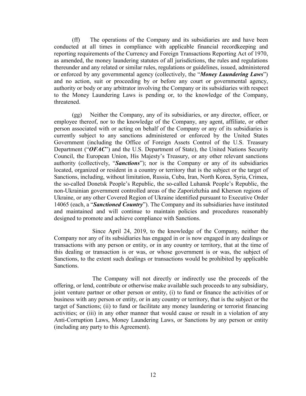 (ff) The operations of the Company and its subsidiaries are and have been conducted at all times in compliance with applicable financial recordkeeping and reporting requirements of the Currency and Foreign Transactions Reporting Act of 1970, as amended, the money laundering statutes of all jurisdictions, the rules and regulations thereunder and any related or similar rules, regulations or guidelines, issued, administered or enforced by any governmental agency (collectively, the “Money Laundering Laws”) and no action, suit or proceeding by or before any court or governmental agency, authority or body or any arbitrator involving the Company or its subsidiaries with respect to the Money Laundering Laws is pending or, to the knowledge of the Company, threatened. (gg) Neither the Company, any of its subsidiaries, or any director, officer, or employee thereof, nor to the knowledge of the Company, any agent, affiliate, or other person associated with or acting on behalf of the Company or any of its subsidiaries is currently subject to any sanctions administered or enforced by the United States Government (including the Office of Foreign Assets Control of the U.S. Treasury Department (“OFAC”) and the U.S. Department of State), the United Nations Security Council, the European Union, His Majesty’s Treasury, or any other relevant sanctions authority (collectively, “Sanctions”); nor is the Company or any of its subsidiaries located, organized or resident in a country or territory that is the subject or the target of Sanctions, including, without limitation, Russia, Cuba, Iran, North Korea, Syria, Crimea, the so-called Donetsk People’s Republic, the so-called Luhansk People’s Republic, the non-Ukrainian government controlled areas of the Zaporizhzhia and Kherson regions of Ukraine, or any other Covered Region of Ukraine identified pursuant to Executive Order 14065 (each, a “Sanctioned Country”). The Company and its subsidiaries have instituted and maintained and will continue to maintain policies and procedures reasonably designed to promote and achieve compliance with Sanctions. Since April 24, 2019, to the knowledge of the Company, neither the Company nor any of its subsidiaries has engaged in or is now engaged in any dealings or transactions with any person or entity, or in any country or territory, that at the time of this dealing or transaction is or was, or whose government is or was, the subject of Sanctions, to the extent such dealings or transactions would be prohibited by applicable Sanctions. The Company will not directly or indirectly use the proceeds of the offering, or lend, contribute or otherwise make available such proceeds to any subsidiary, joint venture partner or other person or entity, (i) to fund or finance the activities of or business with any person or entity, or in any country or territory, that is the subject or the target of Sanctions; (ii) to fund or facilitate any money laundering or terrorist financing activities; or (iii) in any other manner that would cause or result in a violation of any Anti-Corruption Laws, Money Laundering Laws, or Sanctions by any person or entity (including any party to this Agreement). 12