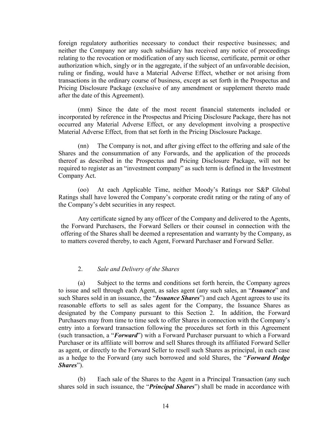 foreign regulatory authorities necessary to conduct their respective businesses; and neither the Company nor any such subsidiary has received any notice of proceedings relating to the revocation or modification of any such license, certificate, permit or other authorization which, singly or in the aggregate, if the subject of an unfavorable decision, ruling or finding, would have a Material Adverse Effect, whether or not arising from transactions in the ordinary course of business, except as set forth in the Prospectus and Pricing Disclosure Package (exclusive of any amendment or supplement thereto made after the date of this Agreement). (mm) Since the date of the most recent financial statements included or incorporated by reference in the Prospectus and Pricing Disclosure Package, there has not occurred any Material Adverse Effect, or any development involving a prospective Material Adverse Effect, from that set forth in the Pricing Disclosure Package. (nn) The Company is not, and after giving effect to the offering and sale of the Shares and the consummation of any Forwards, and the application of the proceeds thereof as described in the Prospectus and Pricing Disclosure Package, will not be required to register as an “investment company” as such term is defined in the Investment Company Act. (oo) At each Applicable Time, neither Moody’s Ratings nor S&P Global Ratings shall have lowered the Company’s corporate credit rating or the rating of any of the Company’s debt securities in any respect. Any certificate signed by any officer of the Company and delivered to the Agents, the Forward Purchasers, the Forward Sellers or their counsel in connection with the offering of the Shares shall be deemed a representation and warranty by the Company, as to matters covered thereby, to each Agent, Forward Purchaser and Forward Seller. 2. Sale and Delivery of the Shares (a) Subject to the terms and conditions set forth herein, the Company agrees to issue and sell through each Agent, as sales agent (any such sales, an “Issuance” and such Shares sold in an issuance, the “Issuance Shares”) and each Agent agrees to use its reasonable efforts to sell as sales agent for the Company, the Issuance Shares as designated by the Company pursuant to this Section 2. In addition, the Forward Purchasers may from time to time seek to offer Shares in connection with the Company’s entry into a forward transaction following the procedures set forth in this Agreement (such transaction, a “Forward”) with a Forward Purchaser pursuant to which a Forward Purchaser or its affiliate will borrow and sell Shares through its affiliated Forward Seller as agent, or directly to the Forward Seller to resell such Shares as principal, in each case as a hedge to the Forward (any such borrowed and sold Shares, the “Forward Hedge Shares”). (b) Each sale of the Shares to the Agent in a Principal Transaction (any such shares sold in such issuance, the “Principal Shares”) shall be made in accordance with 14