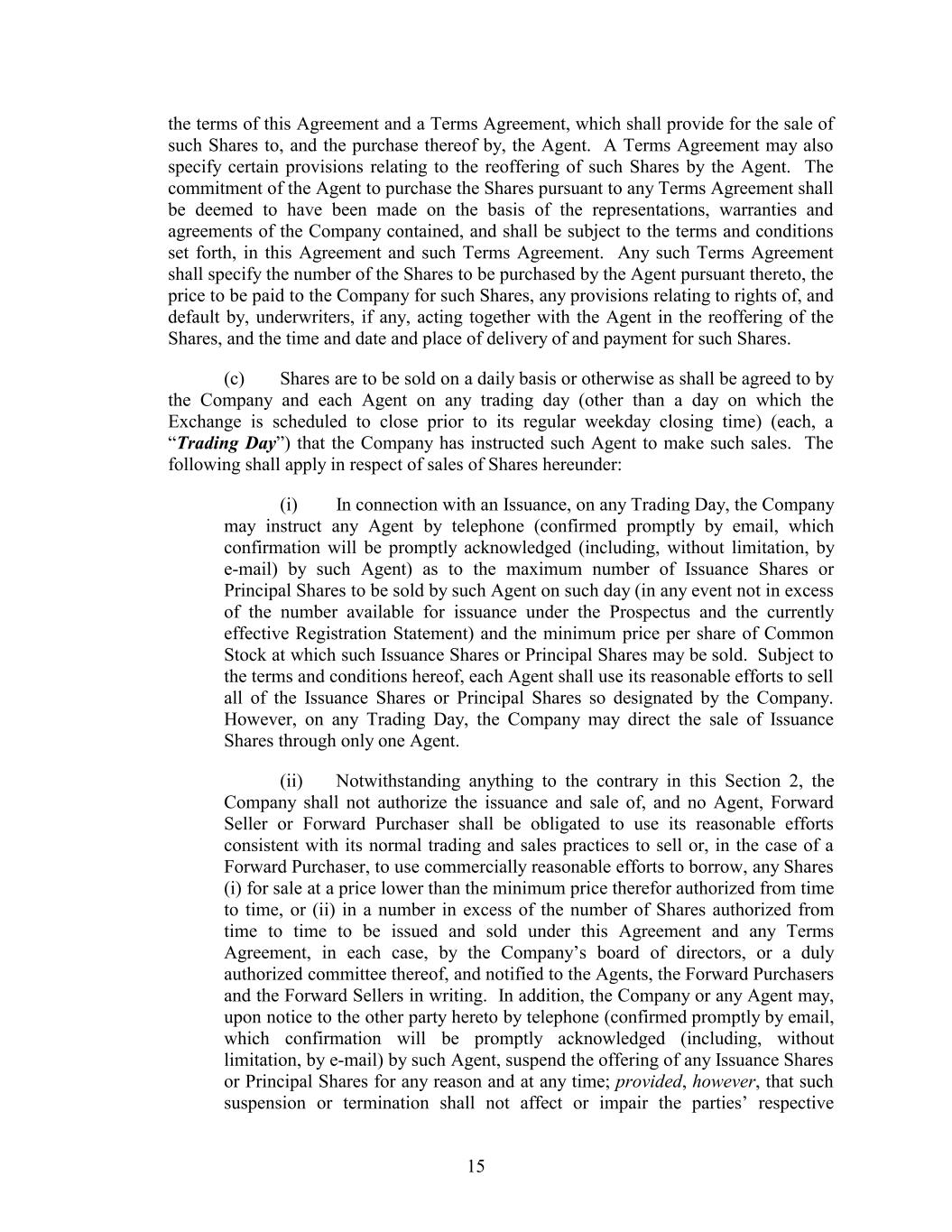 the terms of this Agreement and a Terms Agreement, which shall provide for the sale of such Shares to, and the purchase thereof by, the Agent. A Terms Agreement may also specify certain provisions relating to the reoffering of such Shares by the Agent. The commitment of the Agent to purchase the Shares pursuant to any Terms Agreement shall be deemed to have been made on the basis of the representations, warranties and agreements of the Company contained, and shall be subject to the terms and conditions set forth, in this Agreement and such Terms Agreement. Any such Terms Agreement shall specify the number of the Shares to be purchased by the Agent pursuant thereto, the price to be paid to the Company for such Shares, any provisions relating to rights of, and default by, underwriters, if any, acting together with the Agent in the reoffering of the Shares, and the time and date and place of delivery of and payment for such Shares. (c) Shares are to be sold on a daily basis or otherwise as shall be agreed to by the Company and each Agent on any trading day (other than a day on which the Exchange is scheduled to close prior to its regular weekday closing time) (each, a “Trading Day”) that the Company has instructed such Agent to make such sales. The following shall apply in respect of sales of Shares hereunder: (i) In connection with an Issuance, on any Trading Day, the Company may instruct any Agent by telephone (confirmed promptly by email, which confirmation will be promptly acknowledged (including, without limitation, by e-mail) by such Agent) as to the maximum number of Issuance Shares or Principal Shares to be sold by such Agent on such day (in any event not in excess of the number available for issuance under the Prospectus and the currently effective Registration Statement) and the minimum price per share of Common Stock at which such Issuance Shares or Principal Shares may be sold. Subject to the terms and conditions hereof, each Agent shall use its reasonable efforts to sell all of the Issuance Shares or Principal Shares so designated by the Company. However, on any Trading Day, the Company may direct the sale of Issuance Shares through only one Agent. (ii) Notwithstanding anything to the contrary in this Section 2, the Company shall not authorize the issuance and sale of, and no Agent, Forward Seller or Forward Purchaser shall be obligated to use its reasonable efforts consistent with its normal trading and sales practices to sell or, in the case of a Forward Purchaser, to use commercially reasonable efforts to borrow, any Shares (i) for sale at a price lower than the minimum price therefor authorized from time to time, or (ii) in a number in excess of the number of Shares authorized from time to time to be issued and sold under this Agreement and any Terms Agreement, in each case, by the Company’s board of directors, or a duly authorized committee thereof, and notified to the Agents, the Forward Purchasers and the Forward Sellers in writing. In addition, the Company or any Agent may, upon notice to the other party hereto by telephone (confirmed promptly by email, which confirmation will be promptly acknowledged (including, without limitation, by e-mail) by such Agent, suspend the offering of any Issuance Shares or Principal Shares for any reason and at any time; provided, however, that such suspension or termination shall not affect or impair the parties’ respective 15