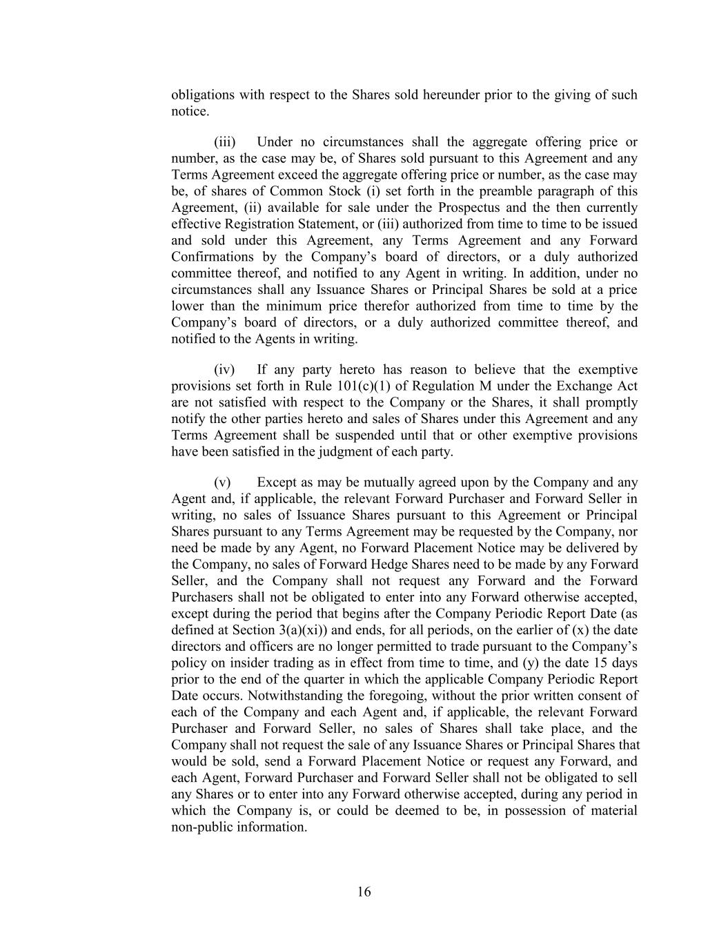 obligations with respect to the Shares sold hereunder prior to the giving of such notice. (iii) Under no circumstances shall the aggregate offering price or number, as the case may be, of Shares sold pursuant to this Agreement and any Terms Agreement exceed the aggregate offering price or number, as the case may be, of shares of Common Stock (i) set forth in the preamble paragraph of this Agreement, (ii) available for sale under the Prospectus and the then currently effective Registration Statement, or (iii) authorized from time to time to be issued and sold under this Agreement, any Terms Agreement and any Forward Confirmations by the Company’s board of directors, or a duly authorized committee thereof, and notified to any Agent in writing. In addition, under no circumstances shall any Issuance Shares or Principal Shares be sold at a price lower than the minimum price therefor authorized from time to time by the Company’s board of directors, or a duly authorized committee thereof, and notified to the Agents in writing. (iv) If any party hereto has reason to believe that the exemptive provisions set forth in Rule 101(c)(1) of Regulation M under the Exchange Act are not satisfied with respect to the Company or the Shares, it shall promptly notify the other parties hereto and sales of Shares under this Agreement and any Terms Agreement shall be suspended until that or other exemptive provisions have been satisfied in the judgment of each party. (v) Except as may be mutually agreed upon by the Company and any Agent and, if applicable, the relevant Forward Purchaser and Forward Seller in writing, no sales of Issuance Shares pursuant to this Agreement or Principal Shares pursuant to any Terms Agreement may be requested by the Company, nor need be made by any Agent, no Forward Placement Notice may be delivered by the Company, no sales of Forward Hedge Shares need to be made by any Forward Seller, and the Company shall not request any Forward and the Forward Purchasers shall not be obligated to enter into any Forward otherwise accepted, except during the period that begins after the Company Periodic Report Date (as defined at Section 3(a)(xi)) and ends, for all periods, on the earlier of (x) the date directors and officers are no longer permitted to trade pursuant to the Company’s policy on insider trading as in effect from time to time, and (y) the date 15 days prior to the end of the quarter in which the applicable Company Periodic Report Date occurs. Notwithstanding the foregoing, without the prior written consent of each of the Company and each Agent and, if applicable, the relevant Forward Purchaser and Forward Seller, no sales of Shares shall take place, and the Company shall not request the sale of any Issuance Shares or Principal Shares that would be sold, send a Forward Placement Notice or request any Forward, and each Agent, Forward Purchaser and Forward Seller shall not be obligated to sell any Shares or to enter into any Forward otherwise accepted, during any period in which the Company is, or could be deemed to be, in possession of material non-public information. 16