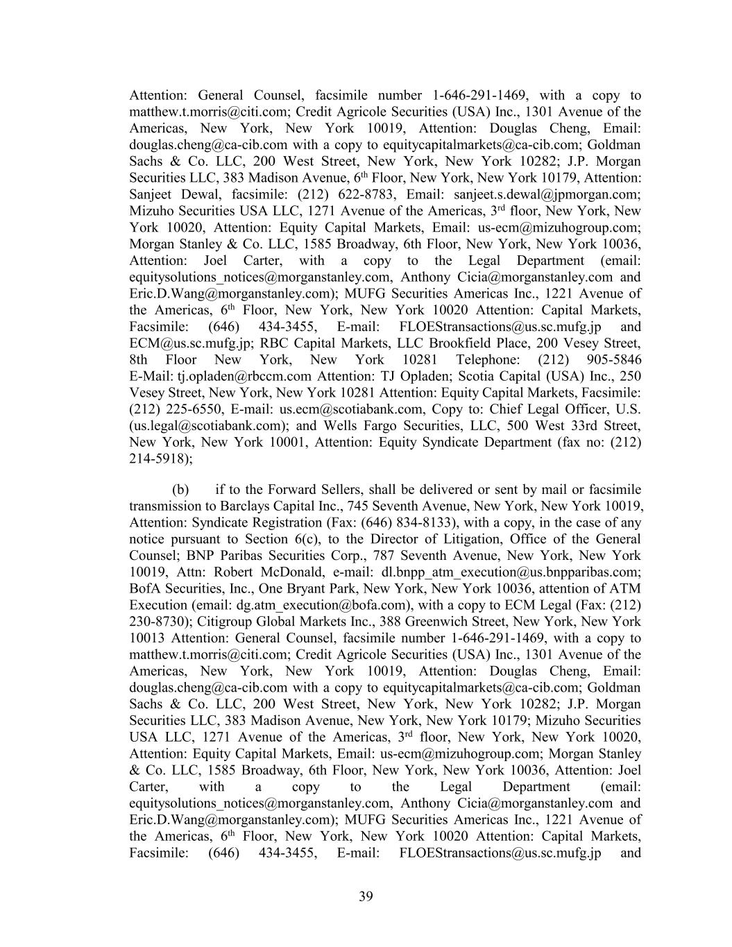 Attention: General Counsel, facsimile number 1-646-291-1469, with a copy to matthew.t.morris@citi.com; Credit Agricole Securities (USA) Inc., 1301 Avenue of the Americas, New York, New York 10019, Attention: Douglas Cheng, Email: douglas.cheng@ca-cib.com with a copy to equitycapitalmarkets@ca-cib.com; Goldman Sachs & Co. LLC, 200 West Street, New York, New York 10282; J.P. Morgan Securities LLC, 383 Madison Avenue, 6th Floor, New York, New York 10179, Attention: Sanjeet Dewal, facsimile: (212) 622-8783, Email: sanjeet.s.dewal@jpmorgan.com; Mizuho Securities USA LLC, 1271 Avenue of the Americas, 3rd floor, New York, New York 10020, Attention: Equity Capital Markets, Email: us-ecm@mizuhogroup.com; Morgan Stanley & Co. LLC, 1585 Broadway, 6th Floor, New York, New York 10036, Attention: Joel Carter, with a copy to the Legal Department (email: equitysolutions_notices@morganstanley.com, Anthony Cicia@morganstanley.com and Eric.D.Wang@morganstanley.com); MUFG Securities Americas Inc., 1221 Avenue of the Americas, 6th Floor, New York, New York 10020 Attention: Capital Markets, Facsimile: (646) 434-3455, E-mail: FLOEStransactions@us.sc.mufg.jp and ECM@us.sc.mufg.jp; RBC Capital Markets, LLC Brookfield Place, 200 Vesey Street, 8th Floor New York, New York 10281 Telephone: (212) 905-5846 E-Mail: tj.opladen@rbccm.com Attention: TJ Opladen; Scotia Capital (USA) Inc., 250 Vesey Street, New York, New York 10281 Attention: Equity Capital Markets, Facsimile: (212) 225-6550, E-mail: us.ecm@scotiabank.com, Copy to: Chief Legal Officer, U.S. (us.legal@scotiabank.com); and Wells Fargo Securities, LLC, 500 West 33rd Street, New York, New York 10001, Attention: Equity Syndicate Department (fax no: (212) 214-5918); (b) if to the Forward Sellers, shall be delivered or sent by mail or facsimile transmission to Barclays Capital Inc., 745 Seventh Avenue, New York, New York 10019, Attention: Syndicate Registration (Fax: (646) 834-8133), with a copy, in the case of any notice pursuant to Section 6(c), to the Director of Litigation, Office of the General Counsel; BNP Paribas Securities Corp., 787 Seventh Avenue, New York, New York 10019, Attn: Robert McDonald, e-mail: dl.bnpp_atm_execution@us.bnpparibas.com; BofA Securities, Inc., One Bryant Park, New York, New York 10036, attention of ATM Execution (email: dg.atm_execution@bofa.com), with a copy to ECM Legal (Fax: (212) 230-8730); Citigroup Global Markets Inc., 388 Greenwich Street, New York, New York 10013 Attention: General Counsel, facsimile number 1-646-291-1469, with a copy to matthew.t.morris@citi.com; Credit Agricole Securities (USA) Inc., 1301 Avenue of the Americas, New York, New York 10019, Attention: Douglas Cheng, Email: douglas.cheng@ca-cib.com with a copy to equitycapitalmarkets@ca-cib.com; Goldman Sachs & Co. LLC, 200 West Street, New York, New York 10282; J.P. Morgan Securities LLC, 383 Madison Avenue, New York, New York 10179; Mizuho Securities USA LLC, 1271 Avenue of the Americas, 3rd floor, New York, New York 10020, Attention: Equity Capital Markets, Email: us-ecm@mizuhogroup.com; Morgan Stanley & Co. LLC, 1585 Broadway, 6th Floor, New York, New York 10036, Attention: Joel Carter, with a copy to the Legal Department (email: equitysolutions_notices@morganstanley.com, Anthony Cicia@morganstanley.com and Eric.D.Wang@morganstanley.com); MUFG Securities Americas Inc., 1221 Avenue of the Americas, 6th Floor, New York, New York 10020 Attention: Capital Markets, Facsimile: (646) 434-3455, E-mail: FLOEStransactions@us.sc.mufg.jp and 39