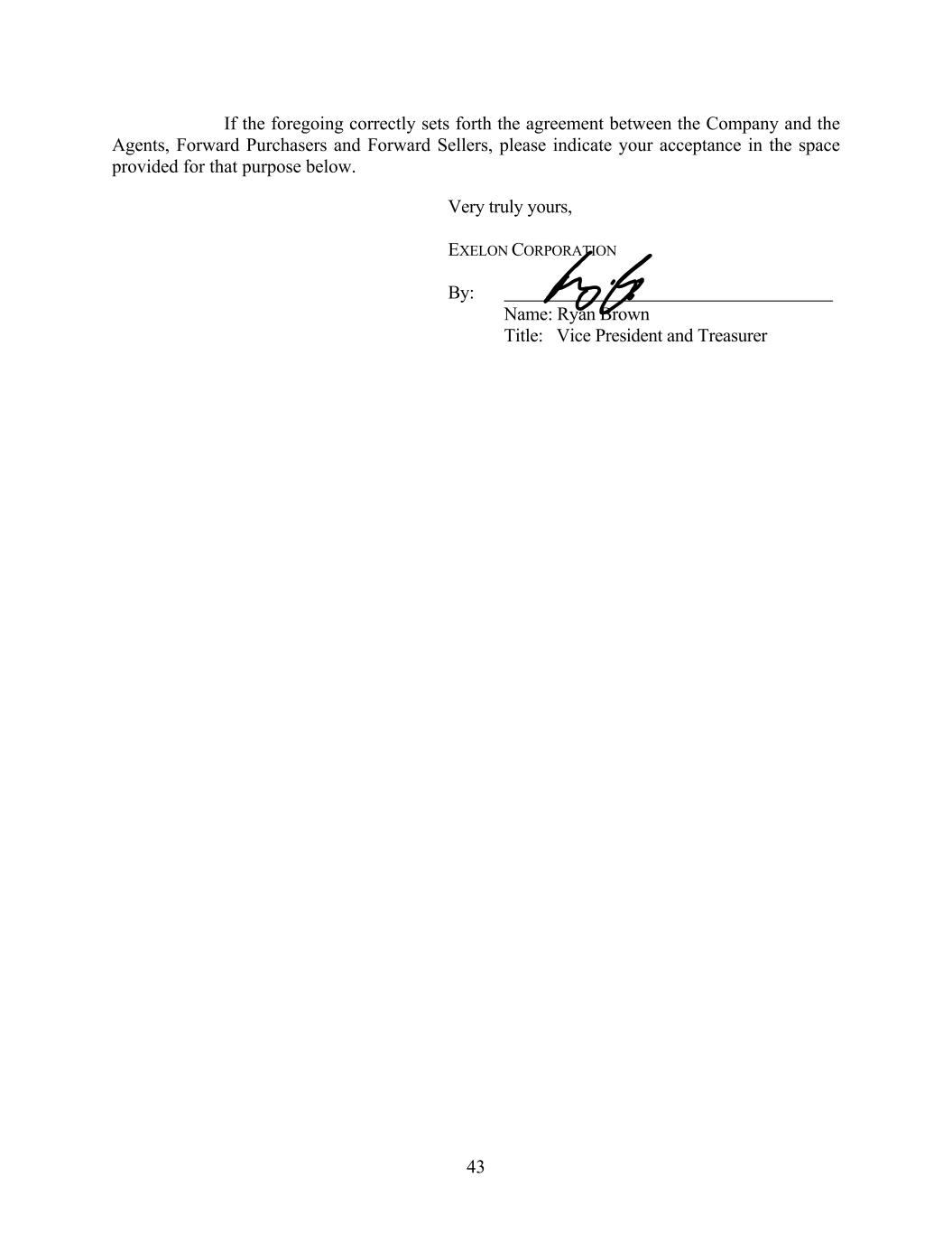 43 If the foregoing correctly sets forth the agreement between the Company and the Agents, Forward Purchasers and Forward Sellers, please indicate your acceptance in the space provided for that purpose below. Very truly yours, EXELON CORPORATION By: Name: Ryan Brown Title: Vice President and Treasurer