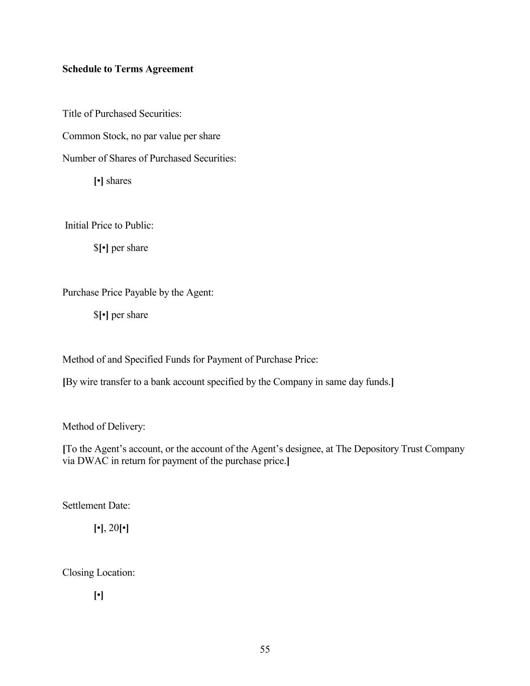 Documents to be Delivered: The documents referred to in Annex A to the Distribution Agreement shall be delivered on the Settlement Date as a condition to the closing for the Purchased Securities. Time of sale: [•] [a.m./p.m.] (New York City time) on [•], [•] Time of sale information: The number of shares of Purchased Securities set forth above The initial price to public set forth above 56