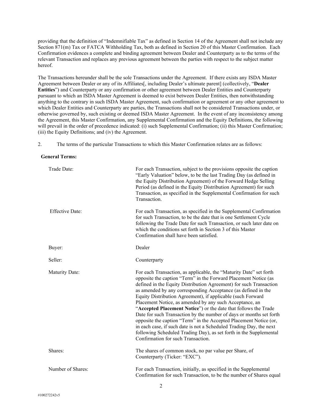 2 #100272242v5 providing that the definition of “Indemnifiable Tax” as defined in Section 14 of the Agreement shall not include any Section 871(m) Tax or FATCA Withholding Tax, both as defined in Section 20 of this Master Confirmation. Each Confirmation evidences a complete and binding agreement between Dealer and Counterparty as to the terms of the relevant Transaction and replaces any previous agreement between the parties with respect to the subject matter hereof. The Transactions hereunder shall be the sole Transactions under the Agreement. If there exists any ISDA Master Agreement between Dealer or any of its Affiliates[, including Dealer’s ultimate parent] (collectively, “Dealer Entities”) and Counterparty or any confirmation or other agreement between Dealer Entities and Counterparty pursuant to which an ISDA Master Agreement is deemed to exist between Dealer Entities, then notwithstanding anything to the contrary in such ISDA Master Agreement, such confirmation or agreement or any other agreement to which Dealer Entities and Counterparty are parties, the Transactions shall not be considered Transactions under, or otherwise governed by, such existing or deemed ISDA Master Agreement. In the event of any inconsistency among the Agreement, this Master Confirmation, any Supplemental Confirmation and the Equity Definitions, the following will prevail in the order of precedence indicated: (i) such Supplemental Confirmation; (ii) this Master Confirmation; (iii) the Equity Definitions; and (iv) the Agreement. 2. The terms of the particular Transactions to which this Master Confirmation relates are as follows: General Terms: Trade Date: For each Transaction, subject to the provisions opposite the caption “Early Valuation” below, to be the last Trading Day (as defined in the Equity Distribution Agreement) of the Forward Hedge Selling Period (as defined in the Equity Distribution Agreement) for such Transaction, as specified in the Supplemental Confirmation for such Transaction. Effective Date: For each Transaction, as specified in the Supplemental Confirmation for such Transaction, to be the date that is one Settlement Cycle following the Trade Date for such Transaction, or such later date on which the conditions set forth in Section 3 of this Master Confirmation shall have been satisfied. Buyer: Dealer Seller: Counterparty Maturity Date: For each Transaction, as applicable, the “Maturity Date” set forth opposite the caption “Term” in the Forward Placement Notice (as defined in the Equity Distribution Agreement) for such Transaction as amended by any corresponding Acceptance (as defined in the Equity Distribution Agreement), if applicable (such Forward Placement Notice, as amended by any such Acceptance, an “Accepted Placement Notice”) or the date that follows the Trade Date for such Transaction by the number of days or months set forth opposite the caption “Term” in the Accepted Placement Notice (or, in each case, if such date is not a Scheduled Trading Day, the next following Scheduled Trading Day), as set forth in the Supplemental Confirmation for such Transaction. Shares: The shares of common stock, no par value per Share, of Counterparty (Ticker: “EXC”). Number of Shares: For each Transaction, initially, as specified in the Supplemental Confirmation for such Transaction, to be the number of Shares equal
