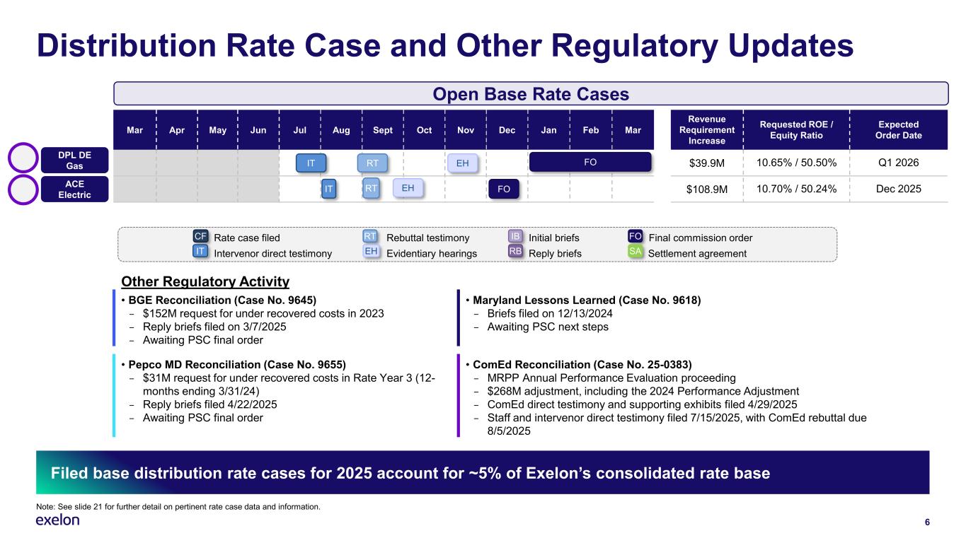 5 Q2 2025 QTD Adjusted Operating Earnings* Waterfall Note: Amounts may not sum due to rounding (1) PECO anticipates filing a petition with the PA PUC in the third quarter of 2025 to defer the extraordinary June storm costs. (2) 2025 earnings guidance based on expected average outstanding shares of 1,014M. $0.28 $0.16 $0.04 $0.09 $0.04 ($0.11) ($0.17) Q2 2024 ($0.05) ComEd PECO $0.01 BGE ($0.02) PHI ($0.06) Corp $0.05 $0.13 $0.14 $0.23 Q2 2025 $0.47 $0.39 BGE PECO PHI ComEd Corp ($0.04) Customer Relief Fund ($0.01) Interest Expense ($0.01) Other $0.01 Distribution and Transmission Rates $0.01 Return on Regulatory Assets ($0.07) Timing of Distribution Earnings ($0.01) Transmission Peak Load $0.01 Other $0.08 Distribution Rates ($0.03) Storm Costs(1) ($0.01) Other $0.02 Distribution Rates ($0.01) Other $0.03 Distribution and Transmission Rates ($0.02) Pepco MYP Reconciliations ($0.01) Credit Loss Expense ($0.01) Interest Expense ($0.01) Other Reaffirming 2025 Adjusted Operating Earnings* of $2.64 - $2.74 per share(2)
