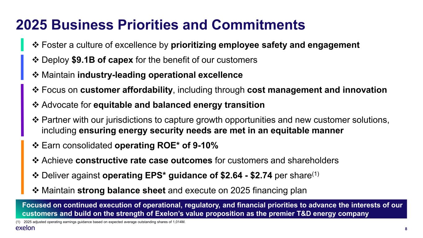 Strong Balance Sheet Provides Strategic and Financial Flexibility Credit Metric Outlook %*(2,3) Credit Ratings / Outlooks(6) ExCorp ComEd PECO BGE ACE DPL Pepco Moody’s Baa2 (Stable) A1 (Stable) Aa3 (Negative) A3 (Stable) A2 (Stable) A2 (Positive) A2 (Stable) S&P BBB+ (Stable) A (Stable) A (Stable) A (Negative) A (Stable) A (Stable) A (Stable) (1) Represents Exelon’s average credit metrics since separation of ~13%; Exelon’s 2022, 2023, and 2024 actuals per S&P and Moody’s published data. (2) 2025–2028 average internal credit metric estimates based on S&P and Moody’s methodology. Chart provides an illustrative view of Exelon’s anticipated trajectory by 2028 and does not reflect year-over-year shaping influenced by one-time items, cash flow timing factors with high certainty of future recovery, among other considerations. (3) With the tax repairs deduction, Corporate Alternative Minimum Tax (CAMT) would be fully mitigated, resulting in a ~0.5% increase to the 2025 – 2028 average credit metric. (4) Represents Moody’s downgrade threshold for Exelon Corporate’s Baa2 senior unsecured rating. S&P’s downgrade threshold is 13% for Exelon Corporate’s BBB+ senior unsecured rating (currently one notch higher than Moody’s). (5) Exelon established a $2.5B ATM program on May 2, 2025, which is effective through May 2, 2028, and replaces the prior $1B ATM program that was set to expire on August 3, 2025. (6) Current senior unsecured ratings for Exelon and BGE and current senior secured ratings for ComEd, PECO, ACE, DPL, and Pepco. 12% 13% 14% 2022 – 2024 Average(1) 2025 2026 2027 2028 Meaningful financial flexibility over downgrade thresholds will strengthen over planning horizon, with further upside from targeted operating levers Downgrade Threshold(4) 7 ▪ Continued financial flexibility over our downgrade thresholds, managing risks while funding growth in a balanced, ratable fashion – Exelon’s scale, jurisdictional diversification, operational excellence, and effective recovery mechanisms contribute to a unique credit-supportive value proposition ▪ Executed ~80% of 2025’s debt financing needs, including all expected at HoldCo, mitigating remaining exposure to interest rate volatility for this year ▪ Pre-issuance hedging strategy further reduces future interest rate volatility ▪ $38B four-year capital expenditure plan being funded in a balanced manner – Financing plan implies $700M of equity to be issued annually through 2028 – Priced 100% of 2025’s annualized equity needs along with ~22% of 2026 needs through ATM(5)