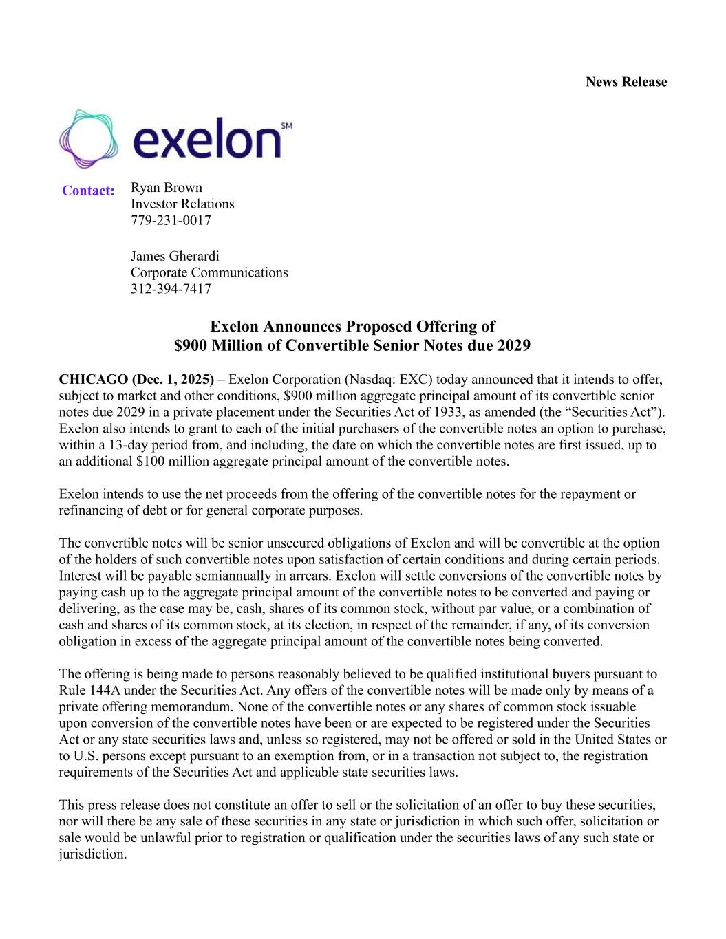 News Release Contact: Ryan Brown Investor Relations 779-231-0017 James Gherardi Corporate Communications 312-394-7417 Exelon Announces Proposed Offering of $900 Million of Convertible Senior Notes due 2029 CHICAGO (Dec. 1, 2025) – Exelon Corporation (Nasdaq: EXC) today announced that it intends to offer, subject to market and other conditions, $900 million aggregate principal amount of its convertible senior notes due 2029 in a private placement under the Securities Act of 1933, as amended (the “Securities Act”). Exelon also intends to grant to each of the initial purchasers of the convertible notes an option to purchase, within a 13-day period from, and including, the date on which the convertible notes are first issued, up to an additional $100 million aggregate principal amount of the convertible notes. Exelon intends to use the net proceeds from the offering of the convertible notes for the repayment or refinancing of debt or for general corporate purposes. The convertible notes will be senior unsecured obligations of Exelon and will be convertible at the option of the holders of such convertible notes upon satisfaction of certain conditions and during certain periods. Interest will be payable semiannually in arrears. Exelon will settle conversions of the convertible notes by paying cash up to the aggregate principal amount of the convertible notes to be converted and paying or delivering, as the case may be, cash, shares of its common stock, without par value, or a combination of cash and shares of its common stock, at its election, in respect of the remainder, if any, of its conversion obligation in excess of the aggregate principal amount of the convertible notes being converted. The offering is being made to persons reasonably believed to be qualified institutional buyers pursuant to Rule 144A under the Securities Act. Any offers of the convertible notes will be made only by means of a private offering memorandum. None of the convertible notes or any shares of common stock issuable upon conversion of the convertible notes have been or are expected to be registered under the Securities Act or any state securities laws and, unless so registered, may not be offered or sold in the United States or to U.S. persons except pursuant to an exemption from, or in a transaction not subject to, the registration requirements of the Securities Act and applicable state securities laws. This press release does not constitute an offer to sell or the solicitation of an offer to buy these securities, nor will there be any sale of these securities in any state or jurisdiction in which such offer, solicitation or sale would be unlawful prior to registration or qualification under the securities laws of any such state or jurisdiction.