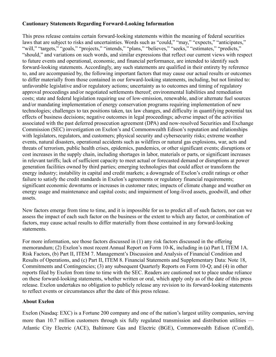 Cautionary Statements Regarding Forward-Looking Information This press release contains certain forward-looking statements within the meaning of federal securities laws that are subject to risks and uncertainties. Words such as “could,” “may,” “expects,” “anticipates,” “will,” “targets,” “goals,” “projects,” “intends,” “plans,” “believes,” “seeks,” “estimates,” “predicts,” “should,” and variations on such words, and similar expressions that reflect our current views with respect to future events and operational, economic, and financial performance, are intended to identify such forward-looking statements. Accordingly, any such statements are qualified in their entirety by reference to, and are accompanied by, the following important factors that may cause our actual results or outcomes to differ materially from those contained in our forward-looking statements, including, but not limited to: unfavorable legislative and/or regulatory actions; uncertainty as to outcomes and timing of regulatory approval proceedings and/or negotiated settlements thereof; environmental liabilities and remediation costs; state and federal legislation requiring use of low-emission, renewable, and/or alternate fuel sources and/or mandating implementation of energy conservation programs requiring implementation of new technologies; challenges to tax positions taken, tax law changes, and difficulty in quantifying potential tax effects of business decisions; negative outcomes in legal proceedings; adverse impact of the activities associated with the past deferred prosecution agreement (DPA) and now-resolved Securities and Exchange Commission (SEC) investigation on Exelon’s and Commonwealth Edison’s reputation and relationships with legislators, regulators, and customers; physical security and cybersecurity risks; extreme weather events, natural disasters, operational accidents such as wildfires or natural gas explosions, war, acts and threats of terrorism, public health crises, epidemics, pandemics, or other significant events; disruptions or cost increases in the supply chain, including shortages in labor, materials or parts, or significant increases in relevant tariffs; lack of sufficient capacity to meet actual or forecasted demand or disruptions at power generation facilities owned by third parties; emerging technologies that could affect or transform the energy industry; instability in capital and credit markets; a downgrade of Exelon’s credit ratings or other failure to satisfy the credit standards in Exelon’s agreements or regulatory financial requirements; significant economic downturns or increases in customer rates; impacts of climate change and weather on energy usage and maintenance and capital costs; and impairment of long-lived assets, goodwill, and other assets. New factors emerge from time to time, and it is impossible for us to predict all of such factors, nor can we assess the impact of each such factor on the business or the extent to which any factor, or combination of factors, may cause actual results to differ materially from those contained in any forward-looking statements. For more information, see those factors discussed in (1) any risk factors discussed in the offering memorandum; (2) Exelon’s most recent Annual Report on Form 10-K, including in (a) Part I, ITEM 1A. Risk Factors, (b) Part II, ITEM 7. Management’s Discussion and Analysis of Financial Condition and Results of Operations, and (c) Part II, ITEM 8. Financial Statements and Supplementary Data: Note 18, Commitments and Contingencies; (3) any subsequent Quarterly Reports on Form 10-Q; and (4) in other reports filed by Exelon from time to time with the SEC. Readers are cautioned not to place undue reliance on these forward-looking statements, whether written or oral, which apply only as of the date of this press release. Exelon undertakes no obligation to publicly release any revision to its forward-looking statements to reflect events or circumstances after the date of this press release. About Exelon Exelon (Nasdaq: EXC) is a Fortune 200 company and one of the nation’s largest utility companies, serving more than 10.7 million customers through six fully regulated transmission and distribution utilities — Atlantic City Electric (ACE), Baltimore Gas and Electric (BGE), Commonwealth Edison (ComEd),