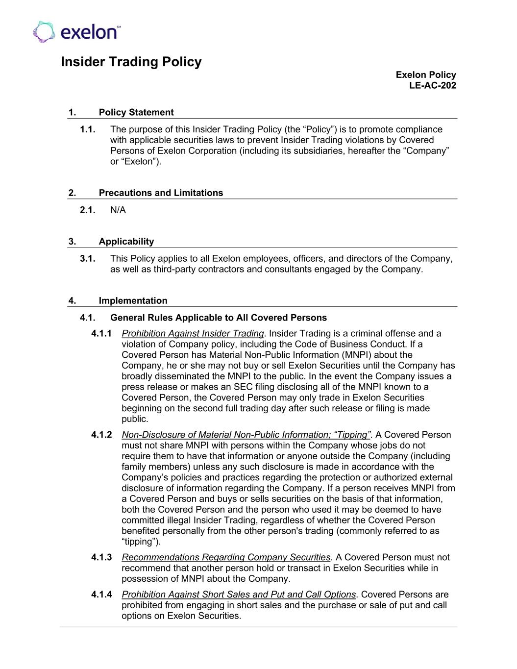 Insider Trading Policy Exelon Policy LE-AC-202 1. Policy Statement 1.1. The purpose of this Insider Trading Policy (the “Policy”) is to promote compliance with applicable securities laws to prevent Insider Trading violations by Covered Persons of Exelon Corporation (including its subsidiaries, hereafter the “Company” or “Exelon”). 2. Precautions and Limitations 2.1. N/A 3. Applicability 3.1. This Policy applies to all Exelon employees, officers, and directors of the Company, as well as third-party contractors and consultants engaged by the Company. 4. Implementation 4.1. General Rules Applicable to All Covered Persons 4.1.1 Prohibition Against Insider Trading. Insider Trading is a criminal offense and a violation of Company policy, including the Code of Business Conduct. If a Covered Person has Material Non-Public Information (MNPI) about the Company, he or she may not buy or sell Exelon Securities until the Company has broadly disseminated the MNPI to the public. In the event the Company issues a press release or makes an SEC filing disclosing all of the MNPI known to a Covered Person, the Covered Person may only trade in Exelon Securities beginning on the second full trading day after such release or filing is made public. 4.1.2 Non-Disclosure of Material Non-Public Information; “Tipping”. A Covered Person must not share MNPI with persons within the Company whose jobs do not require them to have that information or anyone outside the Company (including family members) unless any such disclosure is made in accordance with the Company’s policies and practices regarding the protection or authorized external disclosure of information regarding the Company. If a person receives MNPI from a Covered Person and buys or sells securities on the basis of that information, both the Covered Person and the person who used it may be deemed to have committed illegal Insider Trading, regardless of whether the Covered Person benefited personally from the other person's trading (commonly referred to as “tipping”). 4.1.3 Recommendations Regarding Company Securities. A Covered Person must not recommend that another person hold or transact in Exelon Securities while in possession of MNPI about the Company. 4.1.4 Prohibition Against Short Sales and Put and Call Options. Covered Persons are prohibited from engaging in short sales and the purchase or sale of put and call options on Exelon Securities.