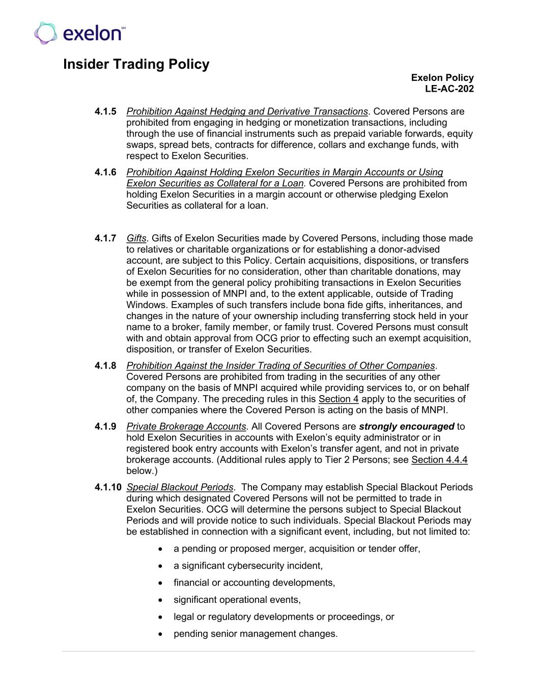 Insider Trading Policy Exelon Policy LE-AC-202 4.1.5 Prohibition Against Hedging and Derivative Transactions. Covered Persons are prohibited from engaging in hedging or monetization transactions, including through the use of financial instruments such as prepaid variable forwards, equity swaps, spread bets, contracts for difference, collars and exchange funds, with respect to Exelon Securities. 4.1.6 Prohibition Against Holding Exelon Securities in Margin Accounts or Using Exelon Securities as Collateral for a Loan. Covered Persons are prohibited from holding Exelon Securities in a margin account or otherwise pledging Exelon Securities as collateral for a loan. 4.1.7 Gifts. Gifts of Exelon Securities made by Covered Persons, including those made to relatives or charitable organizations or for establishing a donor-advised account, are subject to this Policy. Certain acquisitions, dispositions, or transfers of Exelon Securities for no consideration, other than charitable donations, may be exempt from the general policy prohibiting transactions in Exelon Securities while in possession of MNPI and, to the extent applicable, outside of Trading Windows. Examples of such transfers include bona fide gifts, inheritances, and changes in the nature of your ownership including transferring stock held in your name to a broker, family member, or family trust. Covered Persons must consult with and obtain approval from OCG prior to effecting such an exempt acquisition, disposition, or transfer of Exelon Securities. 4.1.8 Prohibition Against the Insider Trading of Securities of Other Companies. Covered Persons are prohibited from trading in the securities of any other company on the basis of MNPI acquired while providing services to, or on behalf of, the Company. The preceding rules in this Section 4 apply to the securities of other companies where the Covered Person is acting on the basis of MNPI. 4.1.9 Private Brokerage Accounts. All Covered Persons are strongly encouraged to hold Exelon Securities in accounts with Exelon’s equity administrator or in registered book entry accounts with Exelon’s transfer agent, and not in private brokerage accounts. (Additional rules apply to Tier 2 Persons; see Section 4.4.4 below.) 4.1.10 Special Blackout Periods. The Company may establish Special Blackout Periods during which designated Covered Persons will not be permitted to trade in Exelon Securities. OCG will determine the persons subject to Special Blackout Periods and will provide notice to such individuals. Special Blackout Periods may be established in connection with a significant event, including, but not limited to: • a pending or proposed merger, acquisition or tender offer, • a significant cybersecurity incident, • financial or accounting developments, • significant operational events, • legal or regulatory developments or proceedings, or • pending senior management changes.