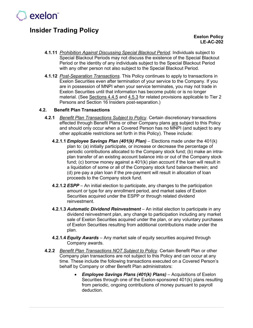 Insider Trading Policy Exelon Policy LE-AC-202 4.1.11 Prohibition Against Discussing Special Blackout Period. Individuals subject to Special Blackout Periods may not discuss the existence of the Special Blackout Period or the identity of any individuals subject to the Special Blackout Period with any other person not also subject to the Special Blackout Period. 4.1.12 Post-Separation Transactions. This Policy continues to apply to transactions in Exelon Securities even after termination of your service to the Company. If you are in possession of MNPI when your service terminates, you may not trade in Exelon Securities until that information has become public or is no longer material. (See Sections 4.4.5 and 4.5.3 for related provisions applicable to Tier 2 Persons and Section 16 Insiders post-separation.) 4.2. Benefit Plan Transactions 4.2.1 Benefit Plan Transactions Subject to Policy. Certain discretionary transactions effected through Benefit Plans or other Company plans are subject to this Policy and should only occur when a Covered Person has no MNPI (and subject to any other applicable restrictions set forth in this Policy). These include: 4.2.1.1 Employee Savings Plan (401(k) Plan) – Elections made under the 401(k) plan to: (a) initially participate, or increase or decrease the percentage of periodic contributions allocated to the Company stock fund; (b) make an intra- plan transfer of an existing account balance into or out of the Company stock fund; (c) borrow money against a 401(k) plan account if the loan will result in a liquidation of some or all of the Company stock fund balance therein; and (d) pre‑pay a plan loan if the pre-payment will result in allocation of loan proceeds to the Company stock fund. 4.2.1.2 ESPP – An initial election to participate, any changes to the participation amount or type for any enrollment period, and market sales of Exelon Securities acquired under the ESPP or through related dividend reinvestment. 4.2.1.3 Automatic Dividend Reinvestment – An initial election to participate in any dividend reinvestment plan, any change to participation including any market sale of Exelon Securities acquired under the plan, or any voluntary purchases of Exelon Securities resulting from additional contributions made under the plan. 4.2.1.4 Equity Awards – Any market sale of equity securities acquired through Company awards. 4.2.2 Benefit Plan Transactions NOT Subject to Policy. Certain Benefit Plan or other Company plan transactions are not subject to this Policy and can occur at any time. These include the following transactions executed on a Covered Person’s behalf by Company or other Benefit Plan administrators: • Employee Savings Plans (401(k) Plans) – Acquisitions of Exelon Securities through one of the Exelon-sponsored 401(k) plans resulting from periodic, ongoing contributions of money pursuant to payroll deduction.