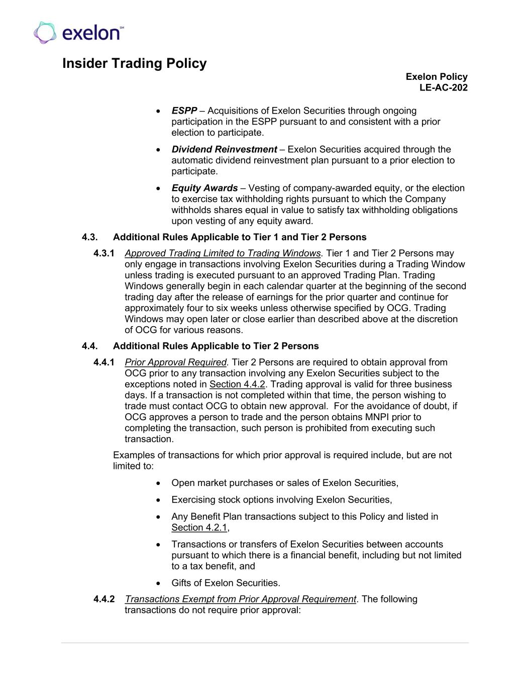 Insider Trading Policy Exelon Policy LE-AC-202 • ESPP – Acquisitions of Exelon Securities through ongoing participation in the ESPP pursuant to and consistent with a prior election to participate. • Dividend Reinvestment – Exelon Securities acquired through the automatic dividend reinvestment plan pursuant to a prior election to participate. • Equity Awards – Vesting of company-awarded equity, or the election to exercise tax withholding rights pursuant to which the Company withholds shares equal in value to satisfy tax withholding obligations upon vesting of any equity award. 4.3. Additional Rules Applicable to Tier 1 and Tier 2 Persons 4.3.1 Approved Trading Limited to Trading Windows. Tier 1 and Tier 2 Persons may only engage in transactions involving Exelon Securities during a Trading Window unless trading is executed pursuant to an approved Trading Plan. Trading Windows generally begin in each calendar quarter at the beginning of the second trading day after the release of earnings for the prior quarter and continue for approximately four to six weeks unless otherwise specified by OCG. Trading Windows may open later or close earlier than described above at the discretion of OCG for various reasons. 4.4. Additional Rules Applicable to Tier 2 Persons 4.4.1 Prior Approval Required. Tier 2 Persons are required to obtain approval from OCG prior to any transaction involving any Exelon Securities subject to the exceptions noted in Section 4.4.2. Trading approval is valid for three business days. If a transaction is not completed within that time, the person wishing to trade must contact OCG to obtain new approval. For the avoidance of doubt, if OCG approves a person to trade and the person obtains MNPI prior to completing the transaction, such person is prohibited from executing such transaction. Examples of transactions for which prior approval is required include, but are not limited to: • Open market purchases or sales of Exelon Securities, • Exercising stock options involving Exelon Securities, • Any Benefit Plan transactions subject to this Policy and listed in Section 4.2.1, • Transactions or transfers of Exelon Securities between accounts pursuant to which there is a financial benefit, including but not limited to a tax benefit, and • Gifts of Exelon Securities. 4.4.2 Transactions Exempt from Prior Approval Requirement. The following transactions do not require prior approval: