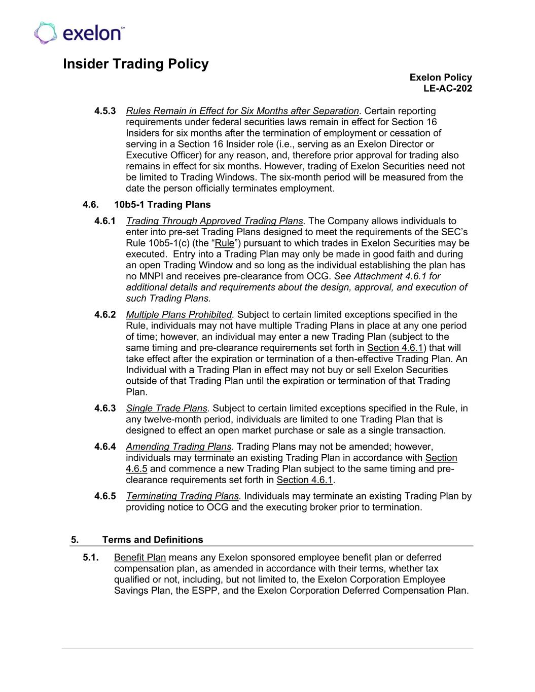 Insider Trading Policy Exelon Policy LE-AC-202 4.5.3 Rules Remain in Effect for Six Months after Separation. Certain reporting requirements under federal securities laws remain in effect for Section 16 Insiders for six months after the termination of employment or cessation of serving in a Section 16 Insider role (i.e., serving as an Exelon Director or Executive Officer) for any reason, and, therefore prior approval for trading also remains in effect for six months. However, trading of Exelon Securities need not be limited to Trading Windows. The six-month period will be measured from the date the person officially terminates employment. 4.6. 10b5-1 Trading Plans 4.6.1 Trading Through Approved Trading Plans. The Company allows individuals to enter into pre-set Trading Plans designed to meet the requirements of the SEC’s Rule 10b5-1(c) (the “Rule”) pursuant to which trades in Exelon Securities may be executed. Entry into a Trading Plan may only be made in good faith and during an open Trading Window and so long as the individual establishing the plan has no MNPI and receives pre-clearance from OCG. See Attachment 4.6.1 for additional details and requirements about the design, approval, and execution of such Trading Plans. 4.6.2 Multiple Plans Prohibited. Subject to certain limited exceptions specified in the Rule, individuals may not have multiple Trading Plans in place at any one period of time; however, an individual may enter a new Trading Plan (subject to the same timing and pre-clearance requirements set forth in Section 4.6.1) that will take effect after the expiration or termination of a then-effective Trading Plan. An Individual with a Trading Plan in effect may not buy or sell Exelon Securities outside of that Trading Plan until the expiration or termination of that Trading Plan. 4.6.3 Single Trade Plans. Subject to certain limited exceptions specified in the Rule, in any twelve-month period, individuals are limited to one Trading Plan that is designed to effect an open market purchase or sale as a single transaction. 4.6.4 Amending Trading Plans. Trading Plans may not be amended; however, individuals may terminate an existing Trading Plan in accordance with Section 4.6.5 and commence a new Trading Plan subject to the same timing and pre- clearance requirements set forth in Section 4.6.1. 4.6.5 Terminating Trading Plans. Individuals may terminate an existing Trading Plan by providing notice to OCG and the executing broker prior to termination. 5. Terms and Definitions 5.1. Benefit Plan means any Exelon sponsored employee benefit plan or deferred compensation plan, as amended in accordance with their terms, whether tax qualified or not, including, but not limited to, the Exelon Corporation Employee Savings Plan, the ESPP, and the Exelon Corporation Deferred Compensation Plan.
