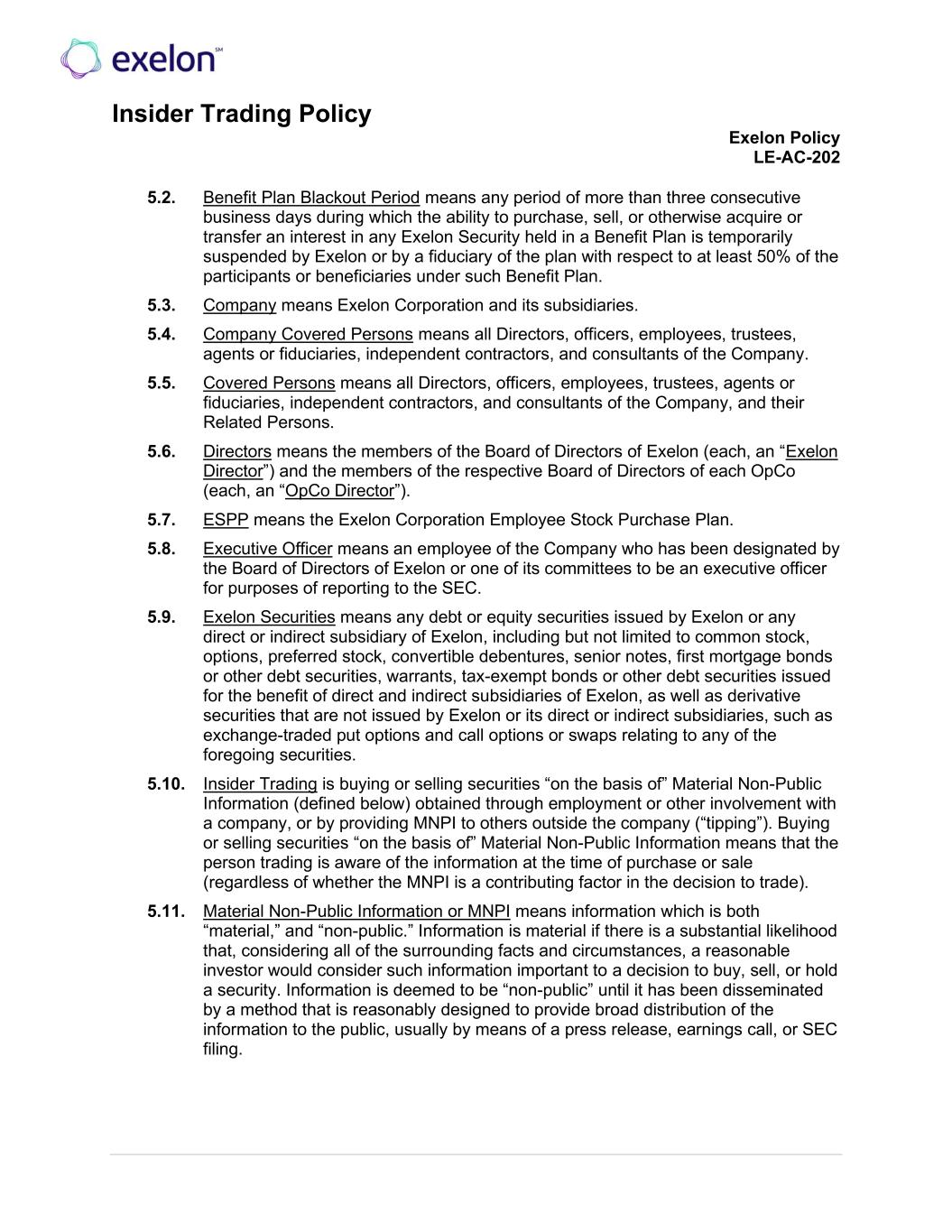 Insider Trading Policy Exelon Policy LE-AC-202 5.2. Benefit Plan Blackout Period means any period of more than three consecutive business days during which the ability to purchase, sell, or otherwise acquire or transfer an interest in any Exelon Security held in a Benefit Plan is temporarily suspended by Exelon or by a fiduciary of the plan with respect to at least 50% of the participants or beneficiaries under such Benefit Plan. 5.3. Company means Exelon Corporation and its subsidiaries. 5.4. Company Covered Persons means all Directors, officers, employees, trustees, agents or fiduciaries, independent contractors, and consultants of the Company. 5.5. Covered Persons means all Directors, officers, employees, trustees, agents or fiduciaries, independent contractors, and consultants of the Company, and their Related Persons. 5.6. Directors means the members of the Board of Directors of Exelon (each, an “Exelon Director”) and the members of the respective Board of Directors of each OpCo (each, an “OpCo Director”). 5.7. ESPP means the Exelon Corporation Employee Stock Purchase Plan. 5.8. Executive Officer means an employee of the Company who has been designated by the Board of Directors of Exelon or one of its committees to be an executive officer for purposes of reporting to the SEC. 5.9. Exelon Securities means any debt or equity securities issued by Exelon or any direct or indirect subsidiary of Exelon, including but not limited to common stock, options, preferred stock, convertible debentures, senior notes, first mortgage bonds or other debt securities, warrants, tax-exempt bonds or other debt securities issued for the benefit of direct and indirect subsidiaries of Exelon, as well as derivative securities that are not issued by Exelon or its direct or indirect subsidiaries, such as exchange-traded put options and call options or swaps relating to any of the foregoing securities. 5.10. Insider Trading is buying or selling securities “on the basis of” Material Non-Public Information (defined below) obtained through employment or other involvement with a company, or by providing MNPI to others outside the company (“tipping”). Buying or selling securities “on the basis of” Material Non-Public Information means that the person trading is aware of the information at the time of purchase or sale (regardless of whether the MNPI is a contributing factor in the decision to trade). 5.11. Material Non-Public Information or MNPI means information which is both “material,” and “non-public.” Information is material if there is a substantial likelihood that, considering all of the surrounding facts and circumstances, a reasonable investor would consider such information important to a decision to buy, sell, or hold a security. Information is deemed to be “non-public” until it has been disseminated by a method that is reasonably designed to provide broad distribution of the information to the public, usually by means of a press release, earnings call, or SEC filing.