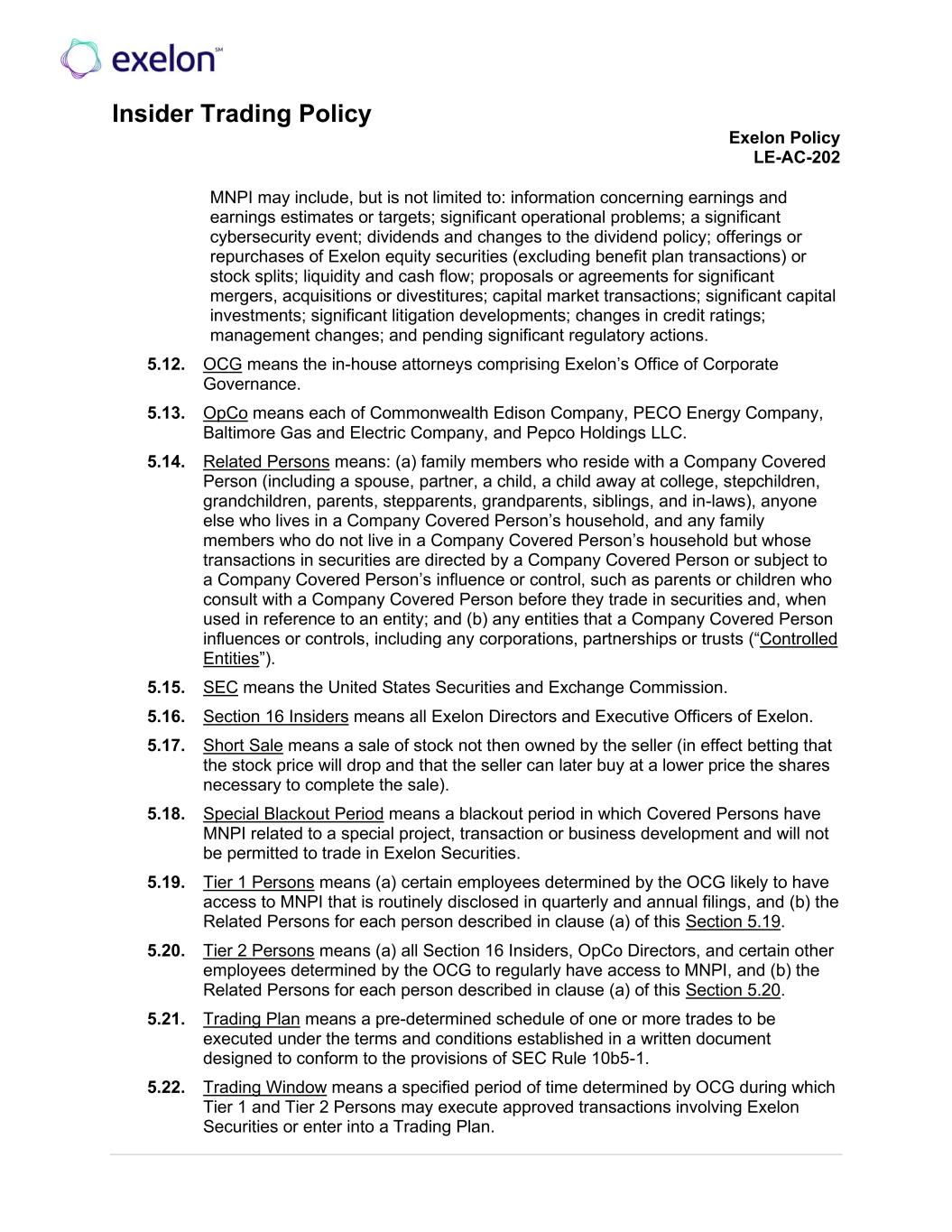 Insider Trading Policy Exelon Policy LE-AC-202 MNPI may include, but is not limited to: information concerning earnings and earnings estimates or targets; significant operational problems; a significant cybersecurity event; dividends and changes to the dividend policy; offerings or repurchases of Exelon equity securities (excluding benefit plan transactions) or stock splits; liquidity and cash flow; proposals or agreements for significant mergers, acquisitions or divestitures; capital market transactions; significant capital investments; significant litigation developments; changes in credit ratings; management changes; and pending significant regulatory actions. 5.12. OCG means the in-house attorneys comprising Exelon’s Office of Corporate Governance. 5.13. OpCo means each of Commonwealth Edison Company, PECO Energy Company, Baltimore Gas and Electric Company, and Pepco Holdings LLC. 5.14. Related Persons means: (a) family members who reside with a Company Covered Person (including a spouse, partner, a child, a child away at college, stepchildren, grandchildren, parents, stepparents, grandparents, siblings, and in-laws), anyone else who lives in a Company Covered Person’s household, and any family members who do not live in a Company Covered Person’s household but whose transactions in securities are directed by a Company Covered Person or subject to a Company Covered Person’s influence or control, such as parents or children who consult with a Company Covered Person before they trade in securities and, when used in reference to an entity; and (b) any entities that a Company Covered Person influences or controls, including any corporations, partnerships or trusts (“Controlled Entities”). 5.15. SEC means the United States Securities and Exchange Commission. 5.16. Section 16 Insiders means all Exelon Directors and Executive Officers of Exelon. 5.17. Short Sale means a sale of stock not then owned by the seller (in effect betting that the stock price will drop and that the seller can later buy at a lower price the shares necessary to complete the sale). 5.18. Special Blackout Period means a blackout period in which Covered Persons have MNPI related to a special project, transaction or business development and will not be permitted to trade in Exelon Securities. 5.19. Tier 1 Persons means (a) certain employees determined by the OCG likely to have access to MNPI that is routinely disclosed in quarterly and annual filings, and (b) the Related Persons for each person described in clause (a) of this Section 5.19. 5.20. Tier 2 Persons means (a) all Section 16 Insiders, OpCo Directors, and certain other employees determined by the OCG to regularly have access to MNPI, and (b) the Related Persons for each person described in clause (a) of this Section 5.20. 5.21. Trading Plan means a pre-determined schedule of one or more trades to be executed under the terms and conditions established in a written document designed to conform to the provisions of SEC Rule 10b5-1. 5.22. Trading Window means a specified period of time determined by OCG during which Tier 1 and Tier 2 Persons may execute approved transactions involving Exelon Securities or enter into a Trading Plan.