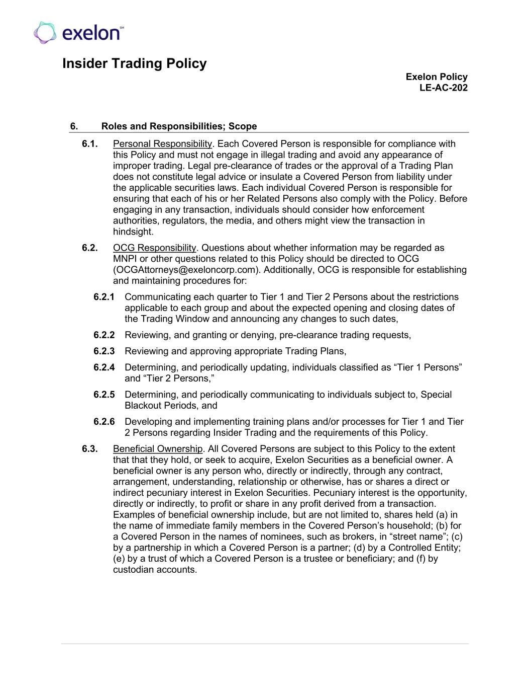 Insider Trading Policy Exelon Policy LE-AC-202 6. Roles and Responsibilities; Scope 6.1. Personal Responsibility. Each Covered Person is responsible for compliance with this Policy and must not engage in illegal trading and avoid any appearance of improper trading. Legal pre-clearance of trades or the approval of a Trading Plan does not constitute legal advice or insulate a Covered Person from liability under the applicable securities laws. Each individual Covered Person is responsible for ensuring that each of his or her Related Persons also comply with the Policy. Before engaging in any transaction, individuals should consider how enforcement authorities, regulators, the media, and others might view the transaction in hindsight. 6.2. OCG Responsibility. Questions about whether information may be regarded as MNPI or other questions related to this Policy should be directed to OCG (OCGAttorneys@exeloncorp.com). Additionally, OCG is responsible for establishing and maintaining procedures for: 6.2.1 Communicating each quarter to Tier 1 and Tier 2 Persons about the restrictions applicable to each group and about the expected opening and closing dates of the Trading Window and announcing any changes to such dates, 6.2.2 Reviewing, and granting or denying, pre-clearance trading requests, 6.2.3 Reviewing and approving appropriate Trading Plans, 6.2.4 Determining, and periodically updating, individuals classified as “Tier 1 Persons” and “Tier 2 Persons,” 6.2.5 Determining, and periodically communicating to individuals subject to, Special Blackout Periods, and 6.2.6 Developing and implementing training plans and/or processes for Tier 1 and Tier 2 Persons regarding Insider Trading and the requirements of this Policy. 6.3. Beneficial Ownership. All Covered Persons are subject to this Policy to the extent that that they hold, or seek to acquire, Exelon Securities as a beneficial owner. A beneficial owner is any person who, directly or indirectly, through any contract, arrangement, understanding, relationship or otherwise, has or shares a direct or indirect pecuniary interest in Exelon Securities. Pecuniary interest is the opportunity, directly or indirectly, to profit or share in any profit derived from a transaction. Examples of beneficial ownership include, but are not limited to, shares held (a) in the name of immediate family members in the Covered Person’s household; (b) for a Covered Person in the names of nominees, such as brokers, in “street name”; (c) by a partnership in which a Covered Person is a partner; (d) by a Controlled Entity; (e) by a trust of which a Covered Person is a trustee or beneficiary; and (f) by custodian accounts.