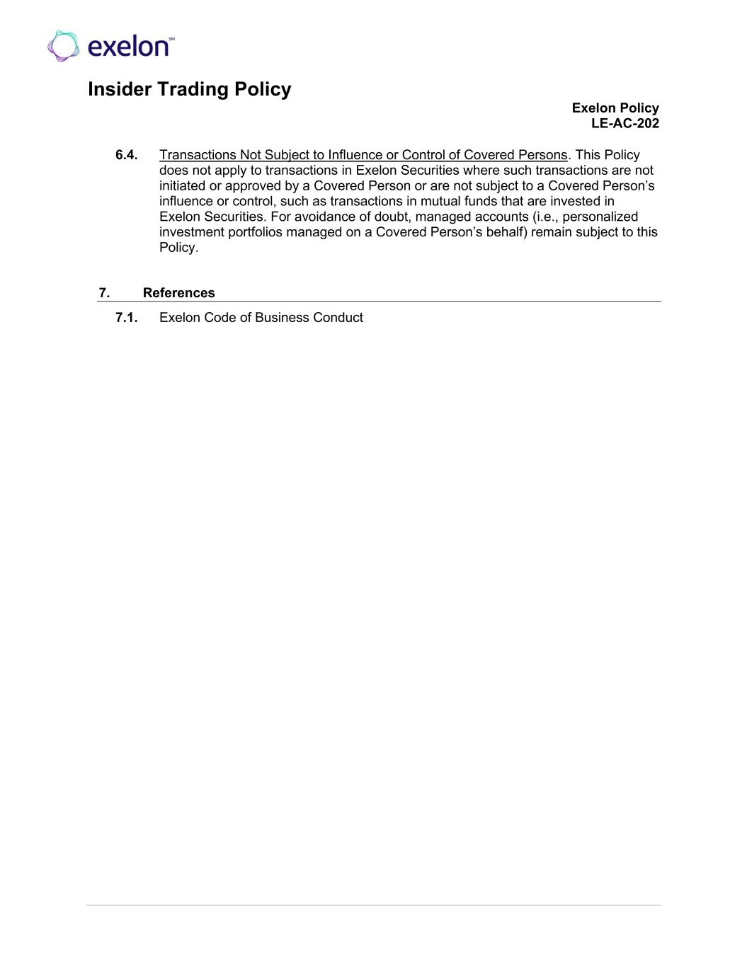Insider Trading Policy Exelon Policy LE-AC-202 6.4. Transactions Not Subject to Influence or Control of Covered Persons. This Policy does not apply to transactions in Exelon Securities where such transactions are not initiated or approved by a Covered Person or are not subject to a Covered Person’s influence or control, such as transactions in mutual funds that are invested in Exelon Securities. For avoidance of doubt, managed accounts (i.e., personalized investment portfolios managed on a Covered Person’s behalf) remain subject to this Policy. 7. References 7.1. Exelon Code of Business Conduct