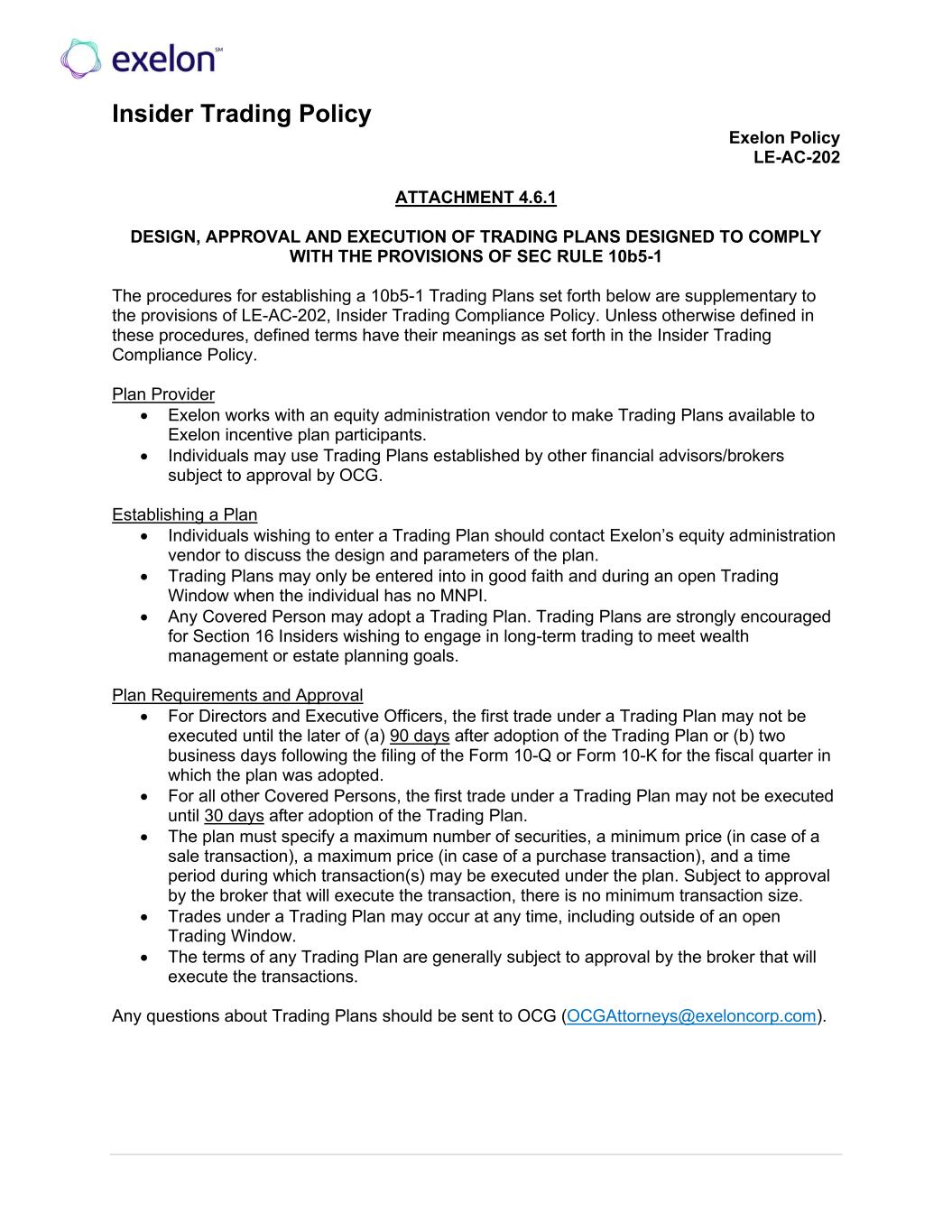 Insider Trading Policy Exelon Policy LE-AC-202 ATTACHMENT 4.6.1 DESIGN, APPROVAL AND EXECUTION OF TRADING PLANS DESIGNED TO COMPLY WITH THE PROVISIONS OF SEC RULE 10b5-1 The procedures for establishing a 10b5-1 Trading Plans set forth below are supplementary to the provisions of LE-AC-202, Insider Trading Compliance Policy. Unless otherwise defined in these procedures, defined terms have their meanings as set forth in the Insider Trading Compliance Policy. Plan Provider • Exelon works with an equity administration vendor to make Trading Plans available to Exelon incentive plan participants. • Individuals may use Trading Plans established by other financial advisors/brokers subject to approval by OCG. Establishing a Plan • Individuals wishing to enter a Trading Plan should contact Exelon’s equity administration vendor to discuss the design and parameters of the plan. • Trading Plans may only be entered into in good faith and during an open Trading Window when the individual has no MNPI. • Any Covered Person may adopt a Trading Plan. Trading Plans are strongly encouraged for Section 16 Insiders wishing to engage in long-term trading to meet wealth management or estate planning goals. Plan Requirements and Approval • For Directors and Executive Officers, the first trade under a Trading Plan may not be executed until the later of (a) 90 days after adoption of the Trading Plan or (b) two business days following the filing of the Form 10-Q or Form 10-K for the fiscal quarter in which the plan was adopted. • For all other Covered Persons, the first trade under a Trading Plan may not be executed until 30 days after adoption of the Trading Plan. • The plan must specify a maximum number of securities, a minimum price (in case of a sale transaction), a maximum price (in case of a purchase transaction), and a time period during which transaction(s) may be executed under the plan. Subject to approval by the broker that will execute the transaction, there is no minimum transaction size. • Trades under a Trading Plan may occur at any time, including outside of an open Trading Window. • The terms of any Trading Plan are generally subject to approval by the broker that will execute the transactions. Any questions about Trading Plans should be sent to OCG (OCGAttorneys@exeloncorp.com).