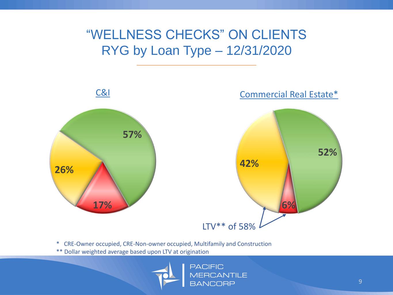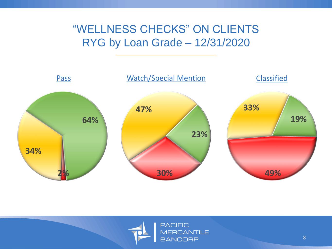 “WELLNESS CHECKS” ON CLIENTS RYG by Loan Grade – 12/31/2020 _________________________________ 8 2% 34% 64% 30% 47% 23% 49% 33% 19% Pass Watch/Special Mention Classified