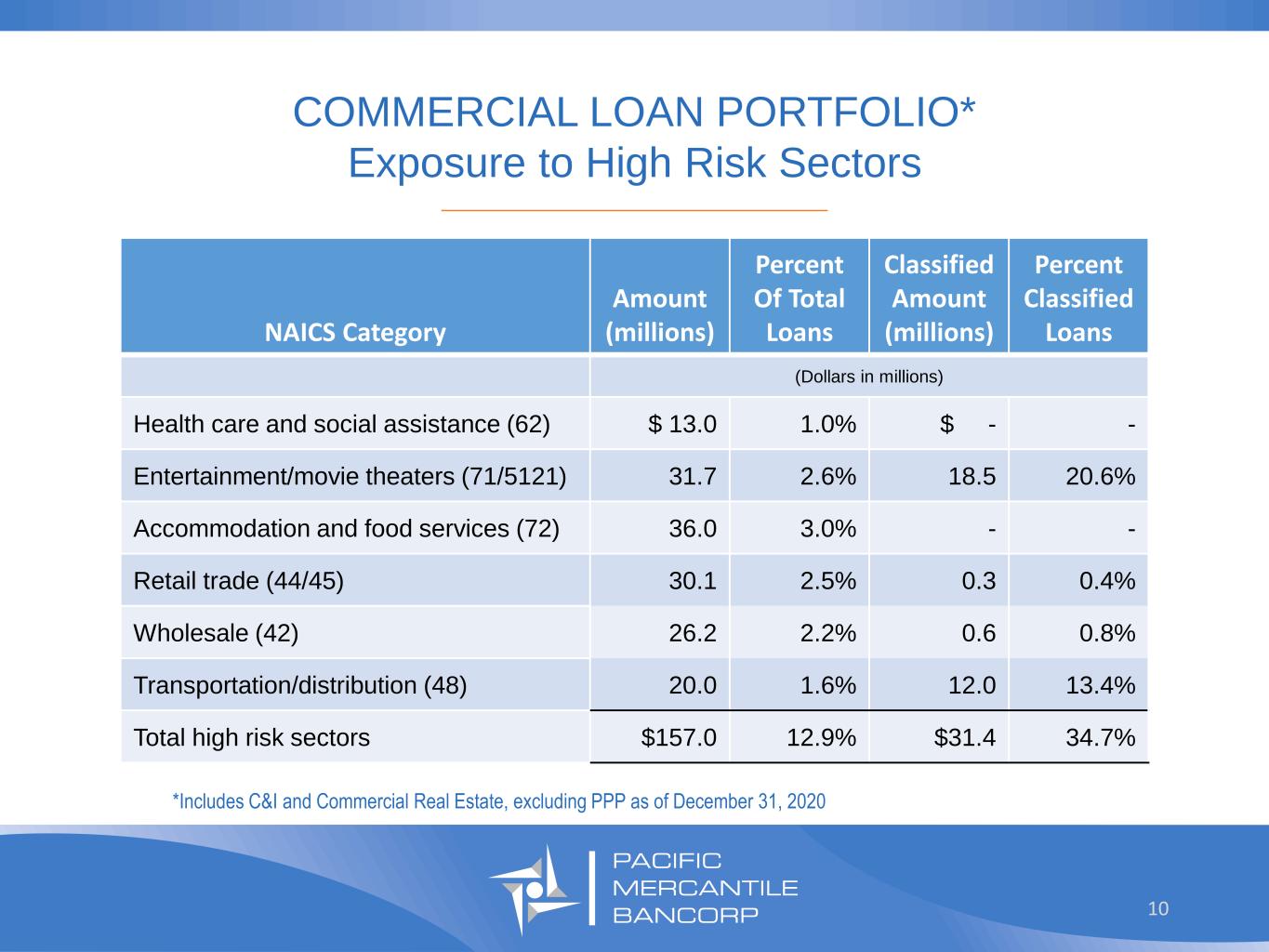 “WELLNESS CHECKS” ON CLIENTS RYG by Loan Type – 12/31/2020 _________________________________ 9 17% 26% 57% 6% 42% 52% C&I Commercial Real Estate* * CRE-Owner occupied, CRE-Non-owner occupied, Multifamily and Construction ** Dollar weighted average based upon LTV at origination LTV** of 58%