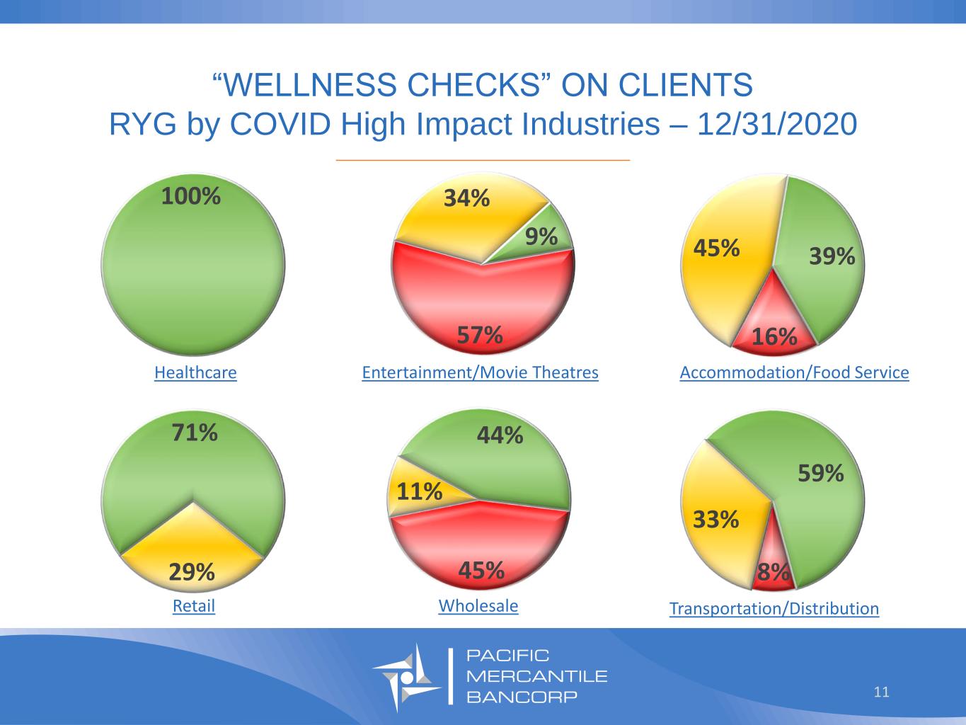 “WELLNESS CHECKS” ON CLIENTS RYG by COVID High Impact Industries – 12/31/2020 _________________________________ 11 100% Healthcare Retail Accommodation/Food ServiceEntertainment/Movie Theatres 29% 71% 16% 45% 39% 57% 34% 9% 45% 11% 44% 8% 33% 59% Wholesale Transportation/Distribution
